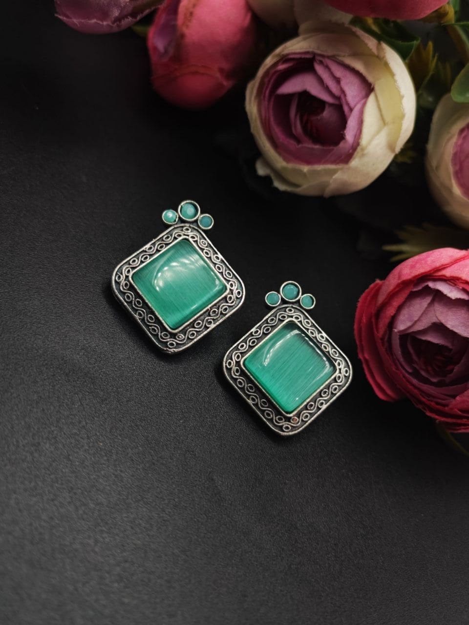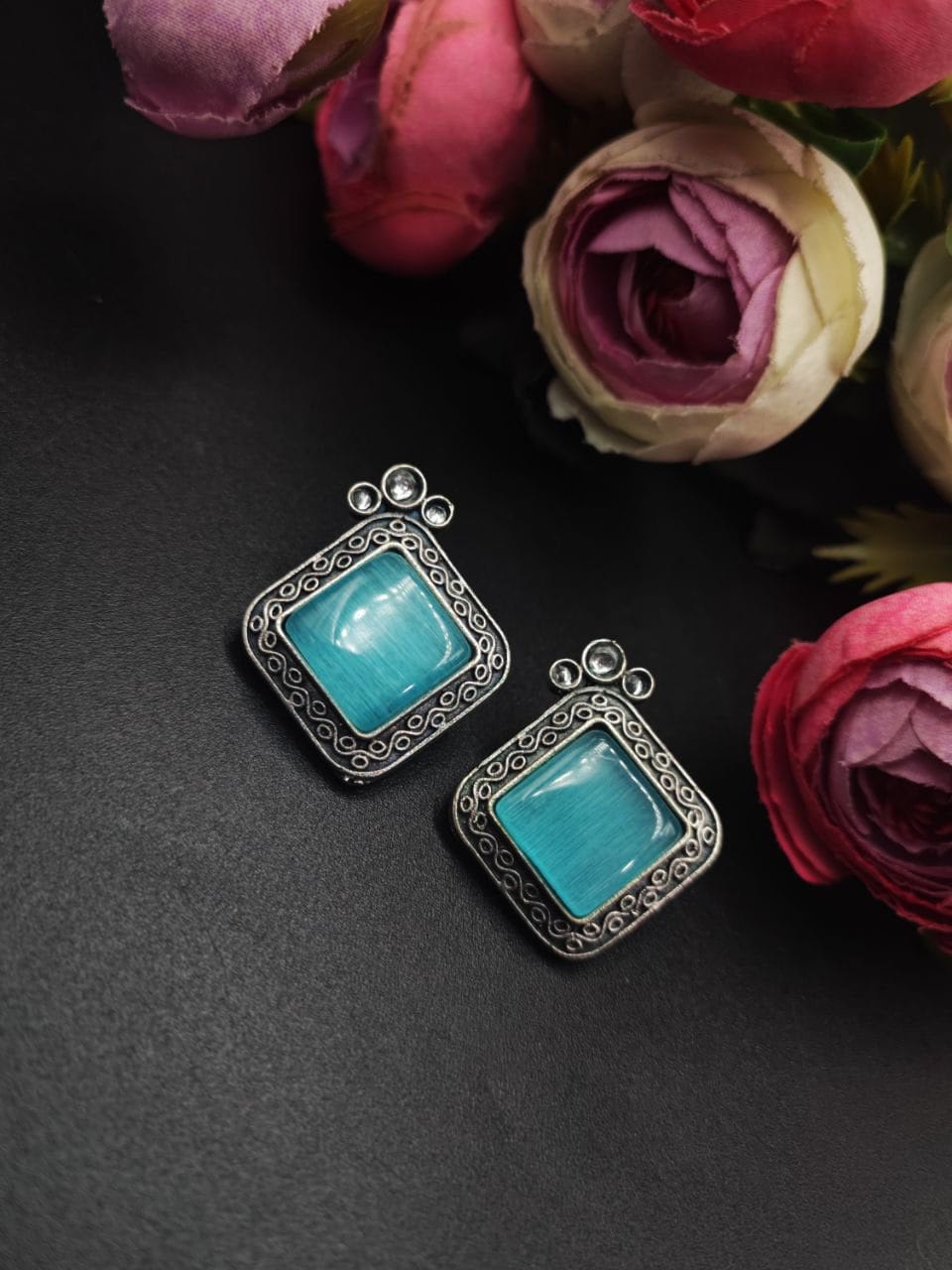 Aqua Elegant Square Monalisa Stone Stud Tops Earring Rustic Silver Oxidized Designer Earring Set