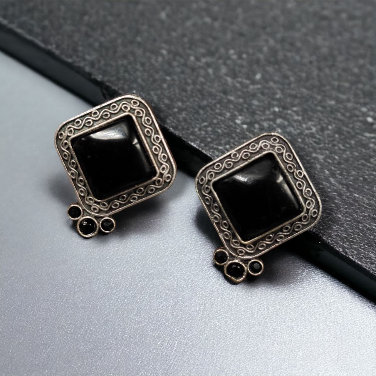 Black Elegant Square Monalisa Stone Stud Tops Earring Rustic Silver Oxidized Designer Earring Set