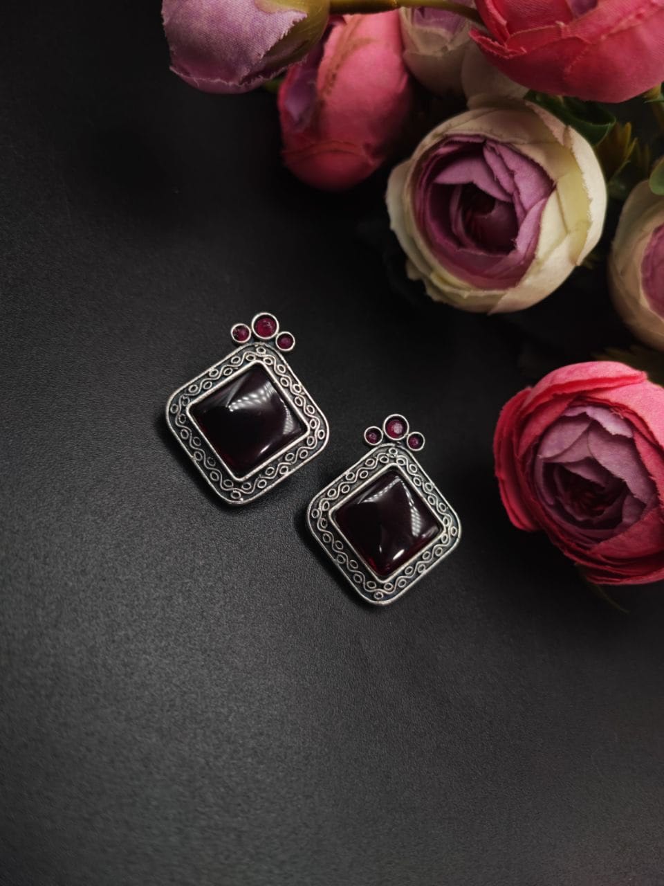 Red Elegant Square Monalisa Stone Stud Tops Earring Rustic Silver Oxidized Designer Earring Set
