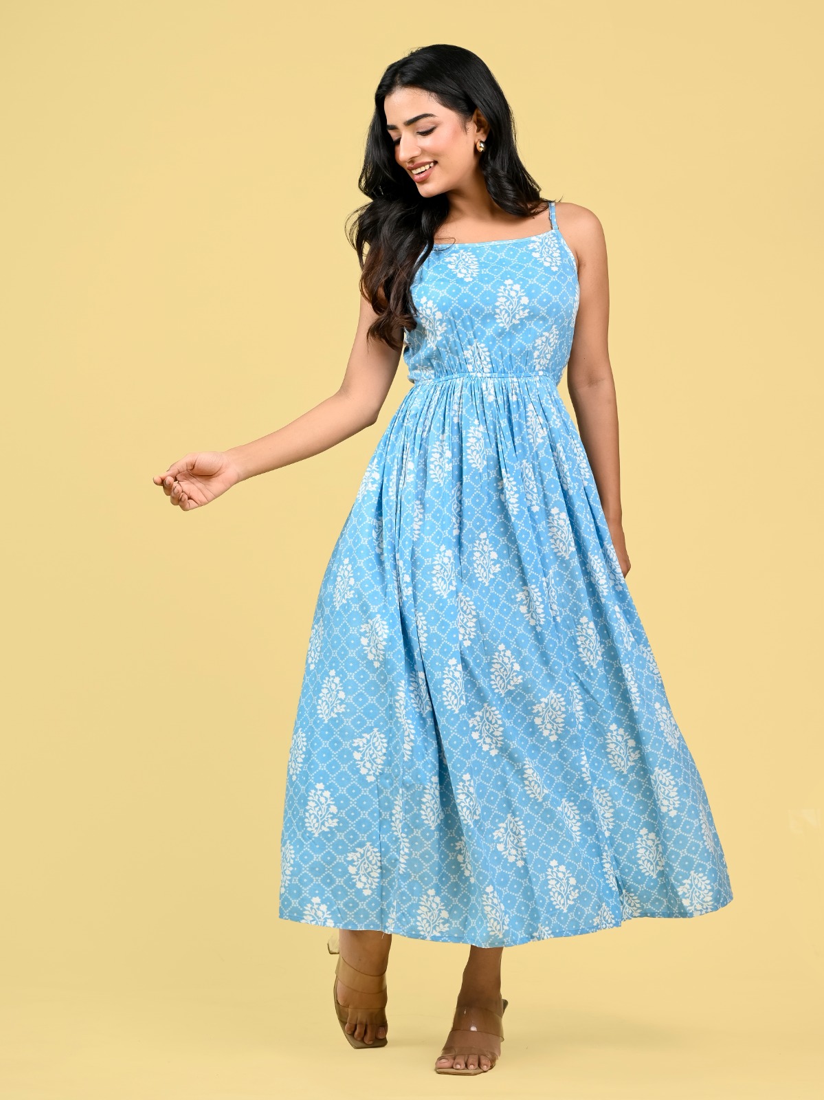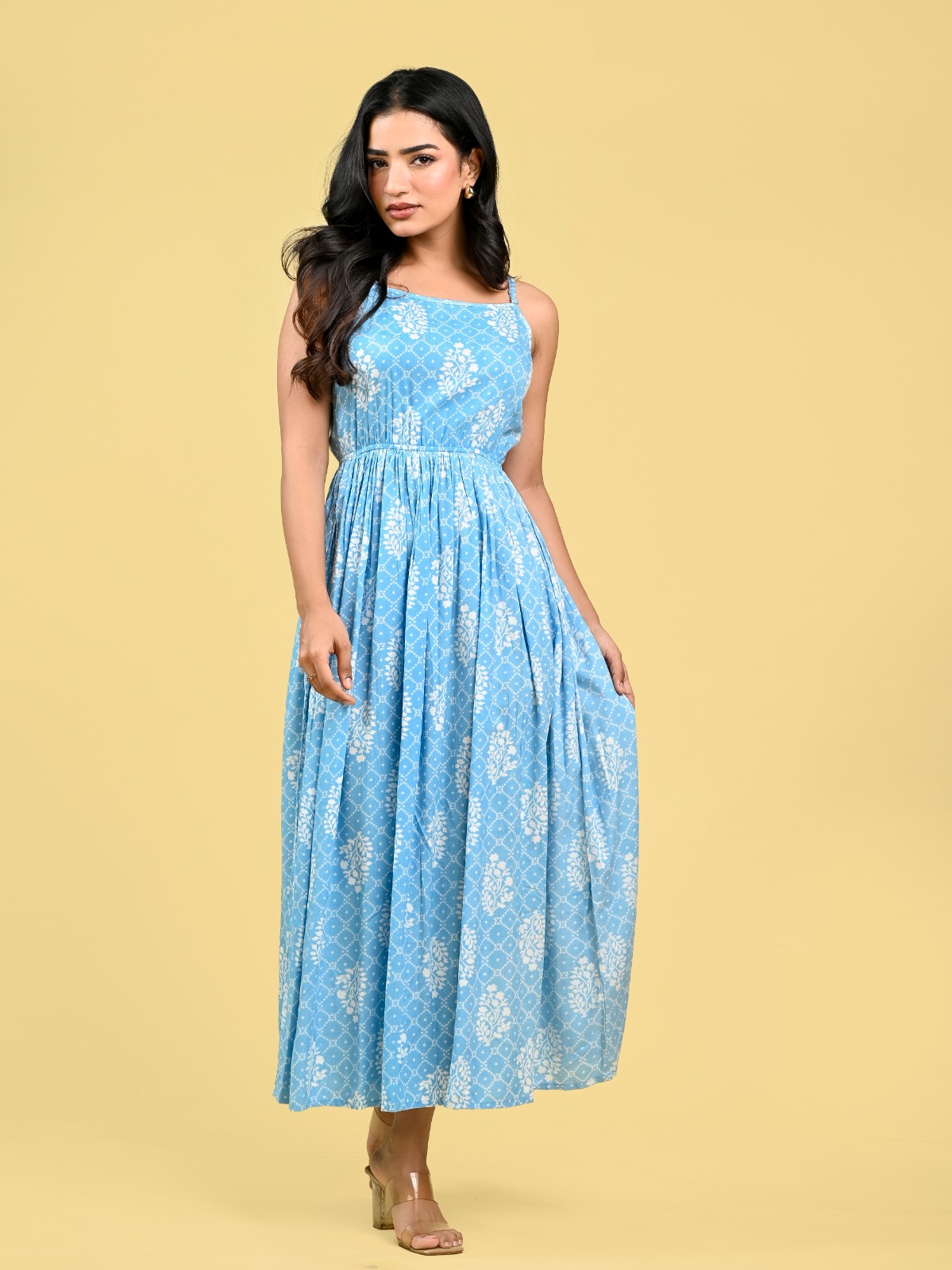 Lavender Western Spaghetti Kurti Partywear Rayon Anarkali Gown Maxi Strap Dress