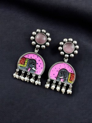 Babypink Stunning Indian Artisans Hand Painted Silver Plated Boho Chandelier Earring Pearl Beads Drop