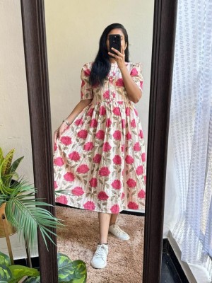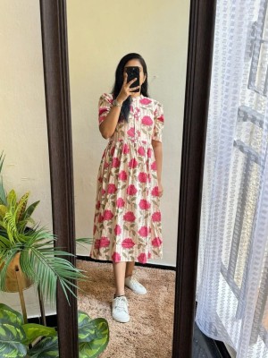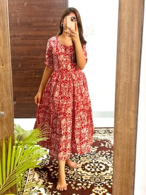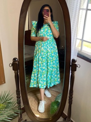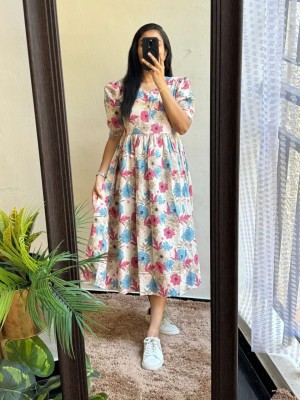 Lavender Floral Printed Cotton Half Sleeves Full Flare Midi Gown Dress For Women
