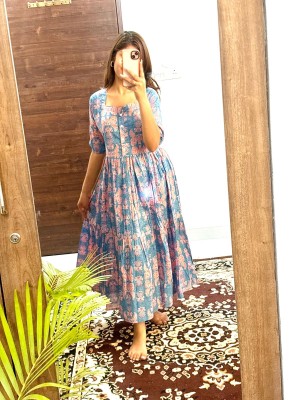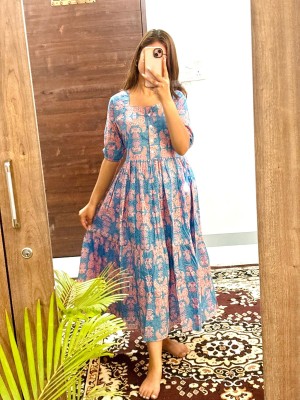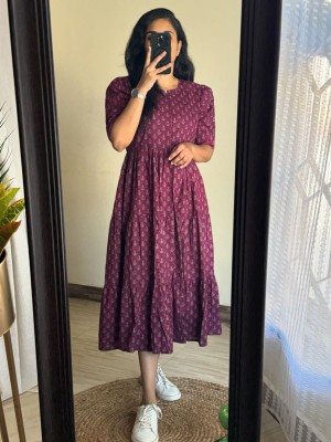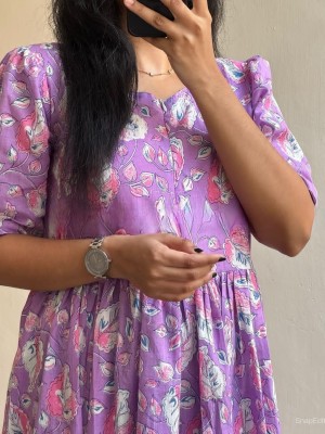 Lavender Floral Printed Cotton Half Sleeves  Full Flare Midi Gown Dress For Women