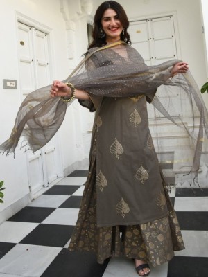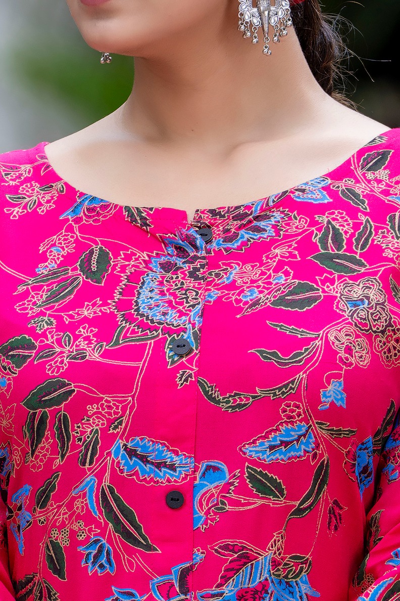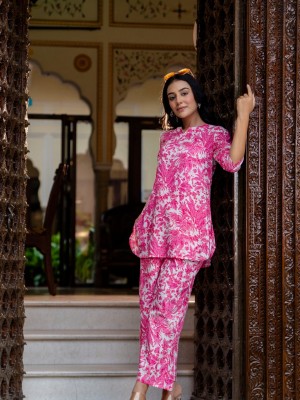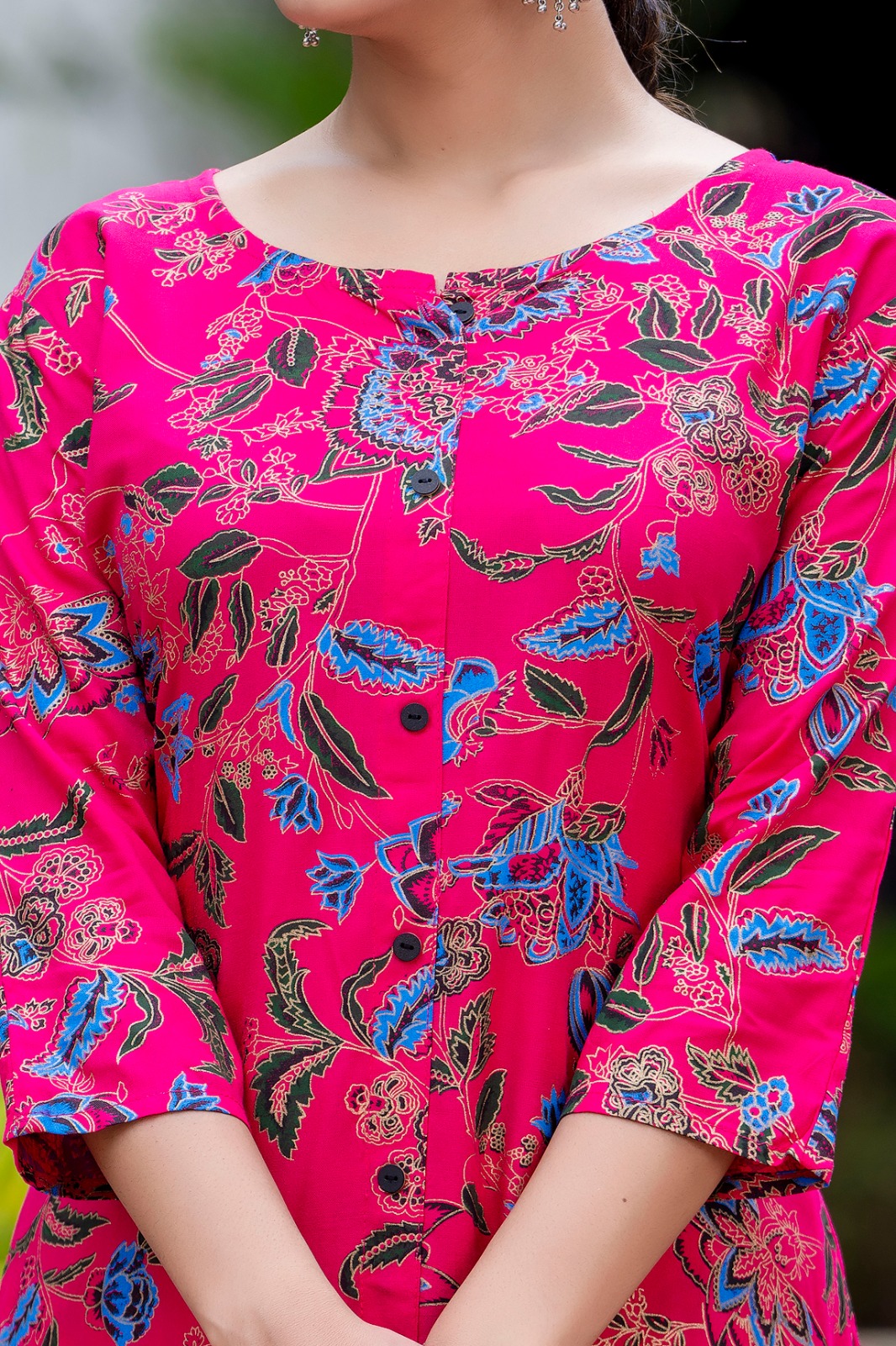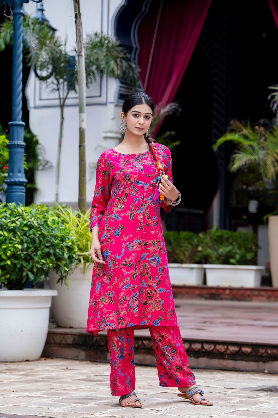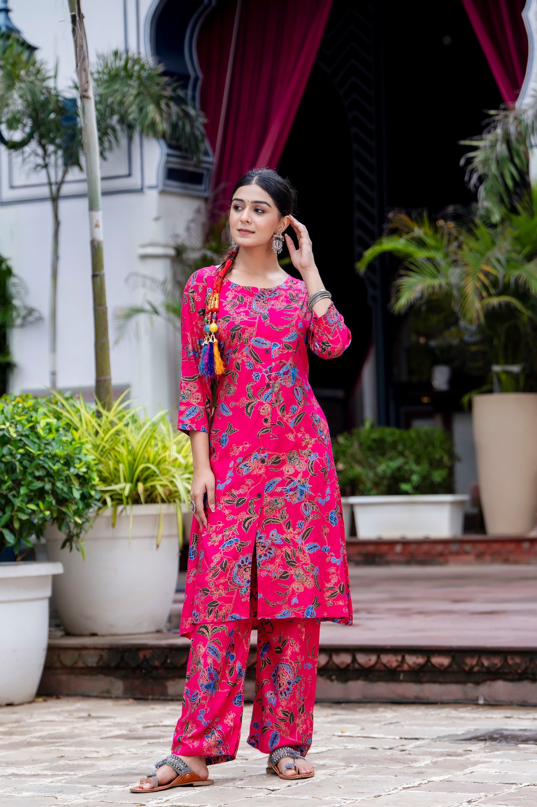Dark Pink Floral Print Casual Wear Kurta Pant Co-Ord Set For Women (Set of 2)