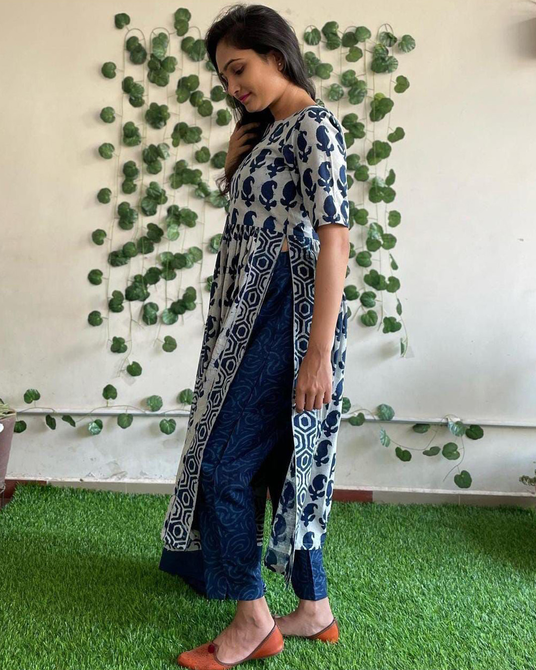 Indigo Blue Side Slit Nayra Cut Kurti Pant Suit Kurta Salwar Kameez Dupatta Set