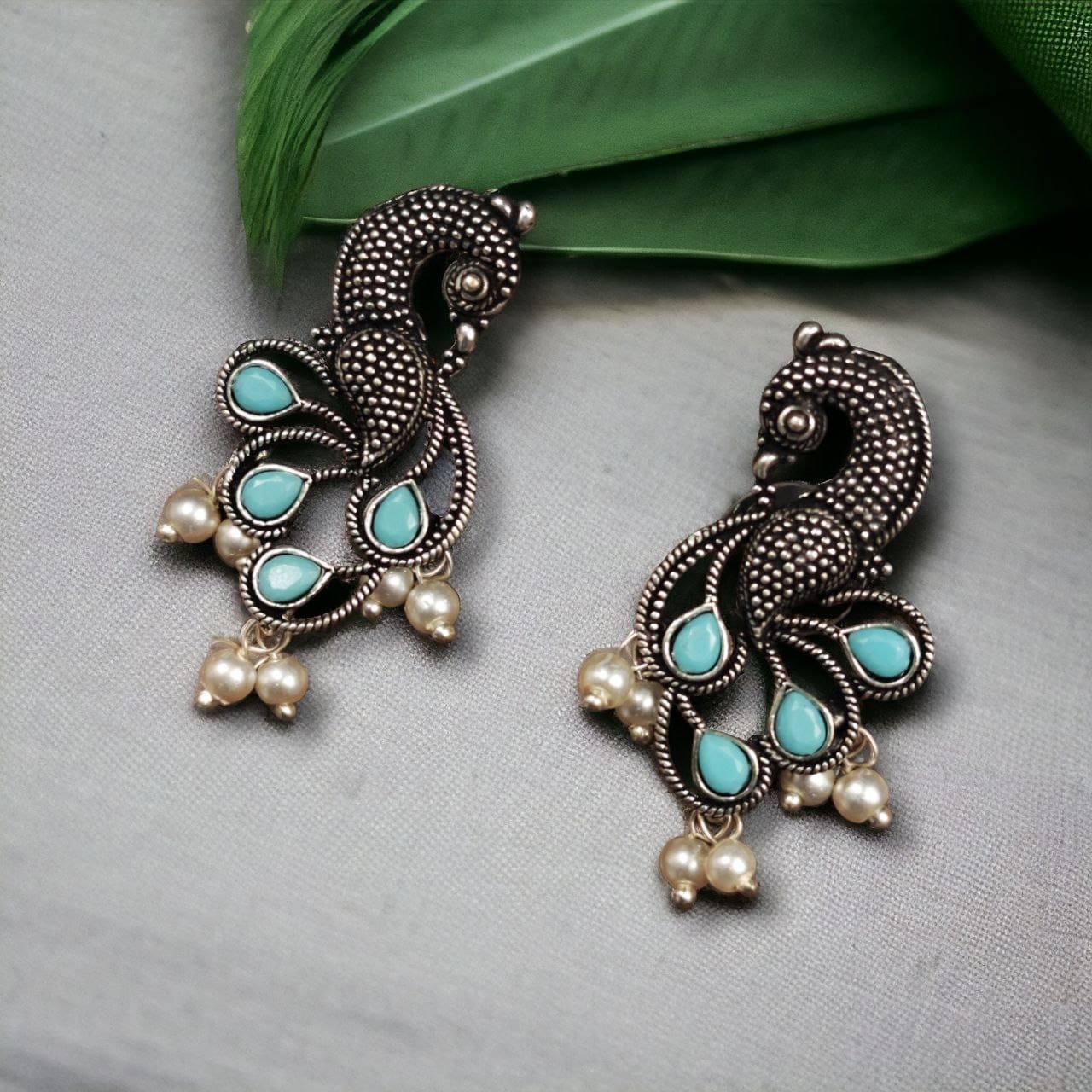 Aqua Ethnic Indian Peacock Designer Silver Oxidized Rustic Stonework Stud Earring with Pearl Beads Drop
