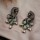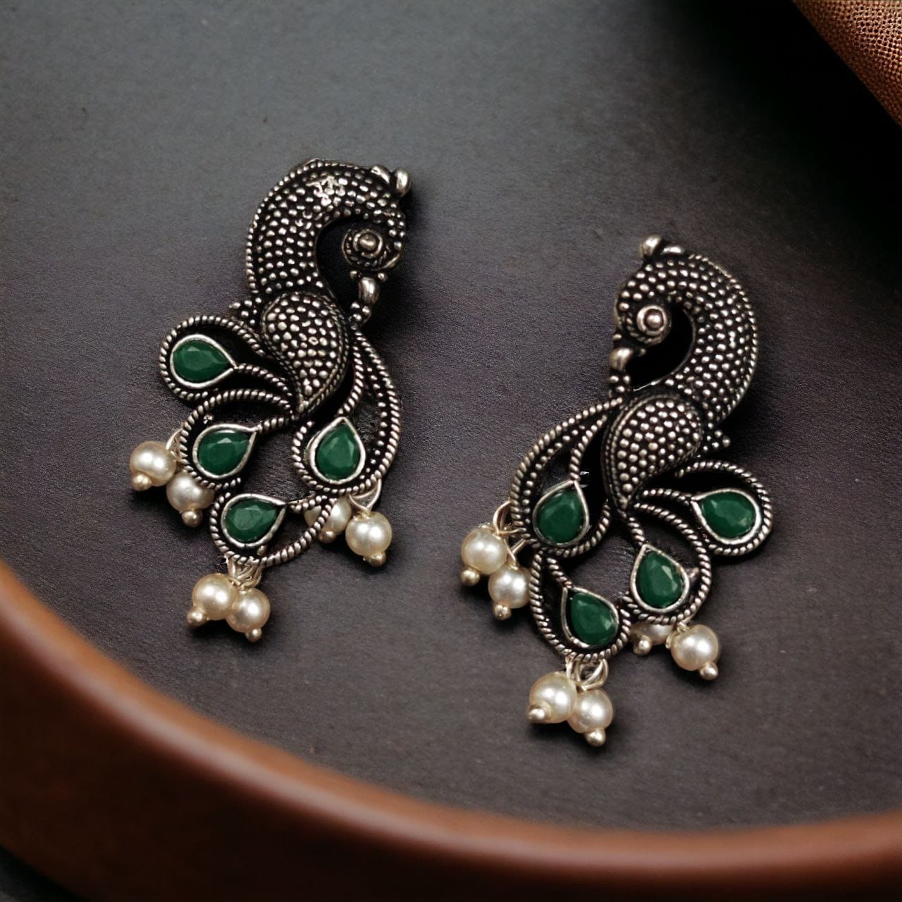 Green Ethnic Indian Peacock Designer Silver Oxidized Rustic Stonework Stud Earring with Pearl Beads Drop