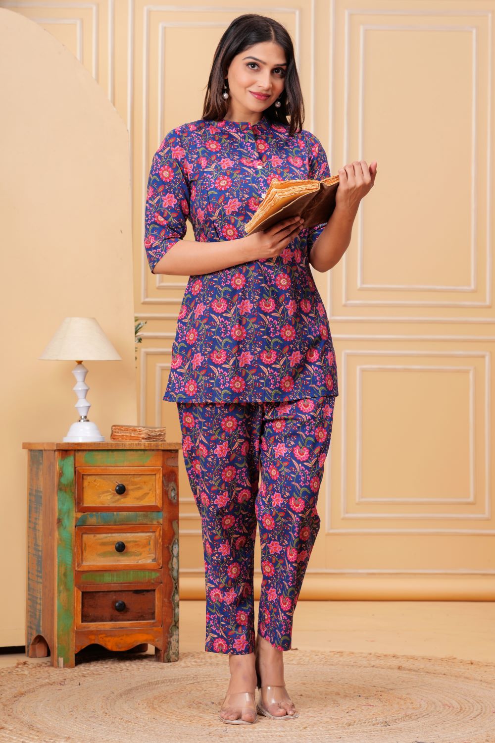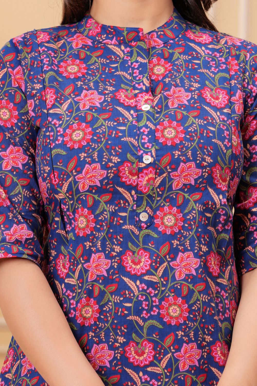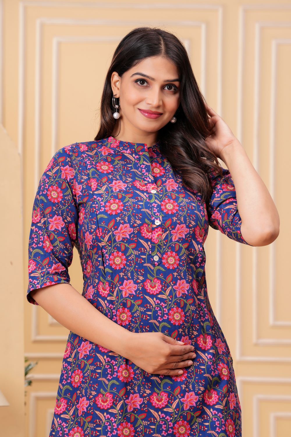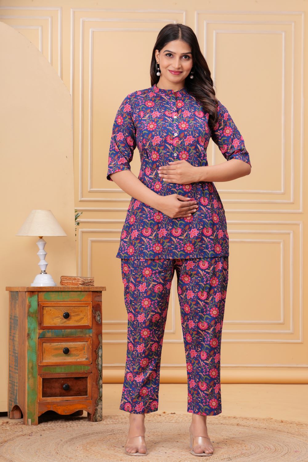 Blue Daily Wear Floral Print Cotton Maternity Co Ord Set For Baby Milk Feeding Top with Hidden Feeding Zip (Set of 2)