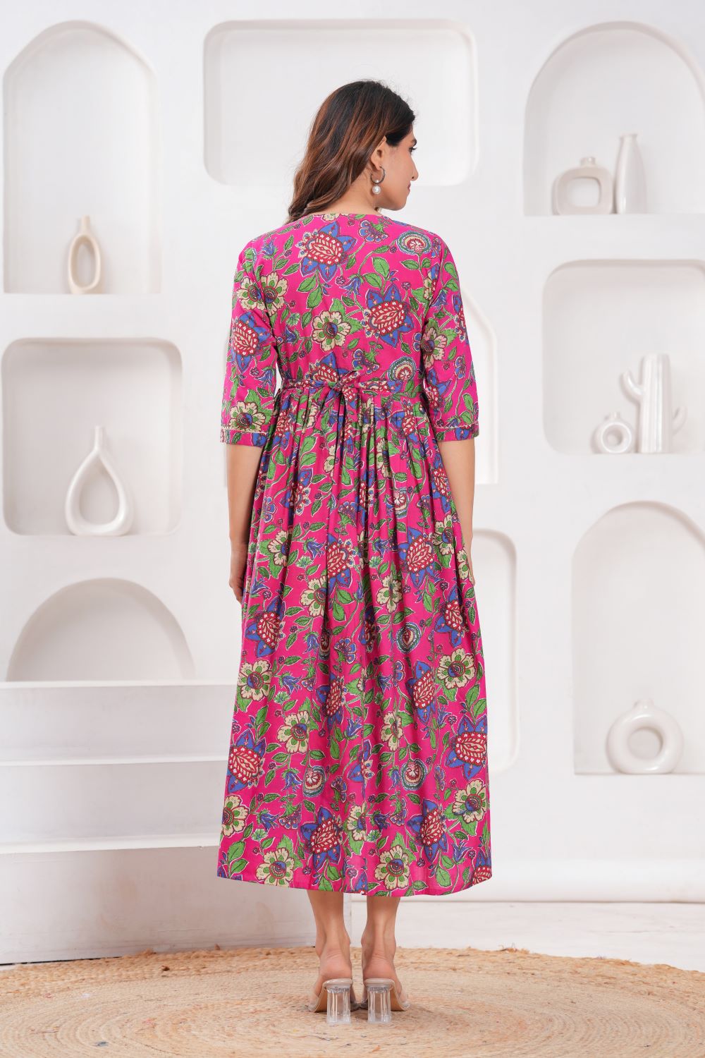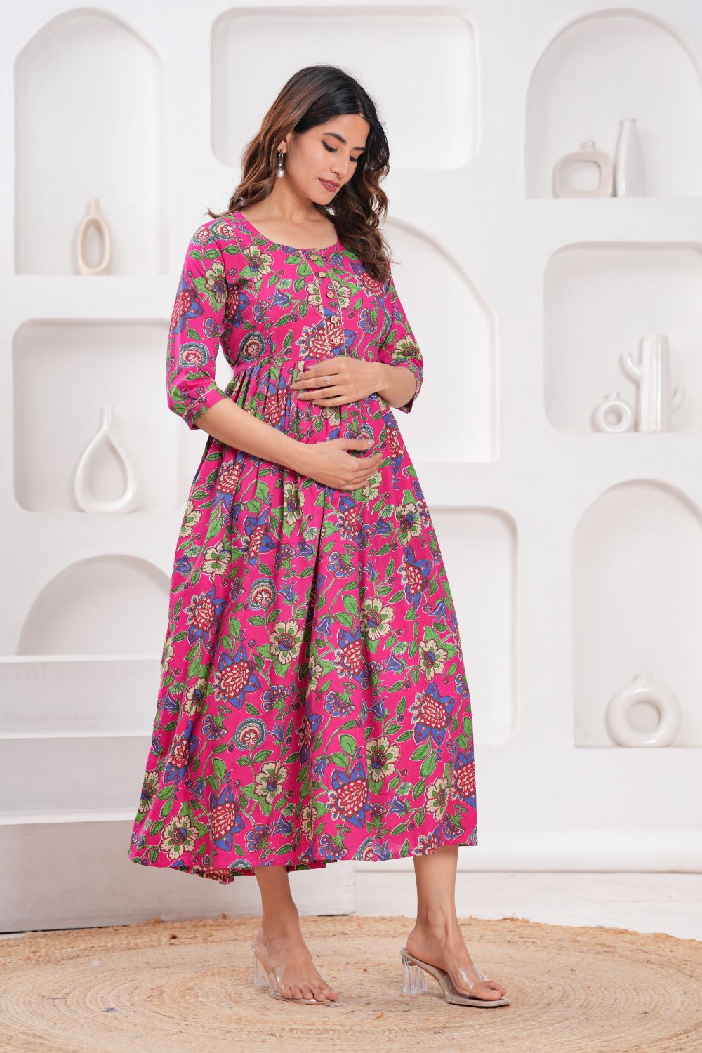 Pink Floral Print Daily WearSoft Cotton Maternity Gown for Baby Feeding Anarkali Kurti with Hidden Zip