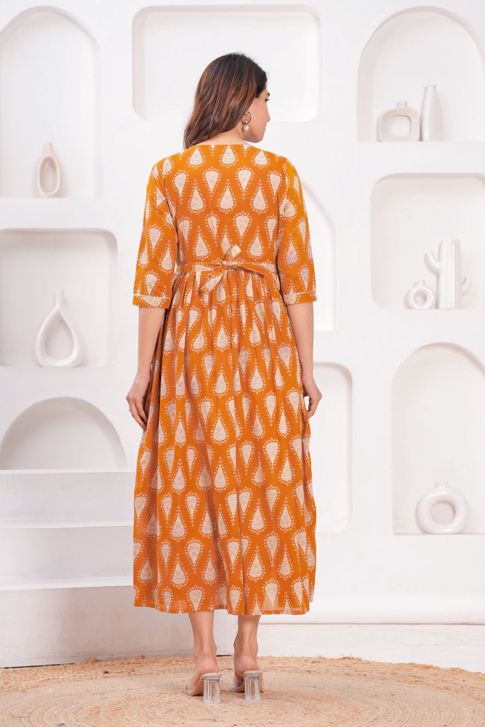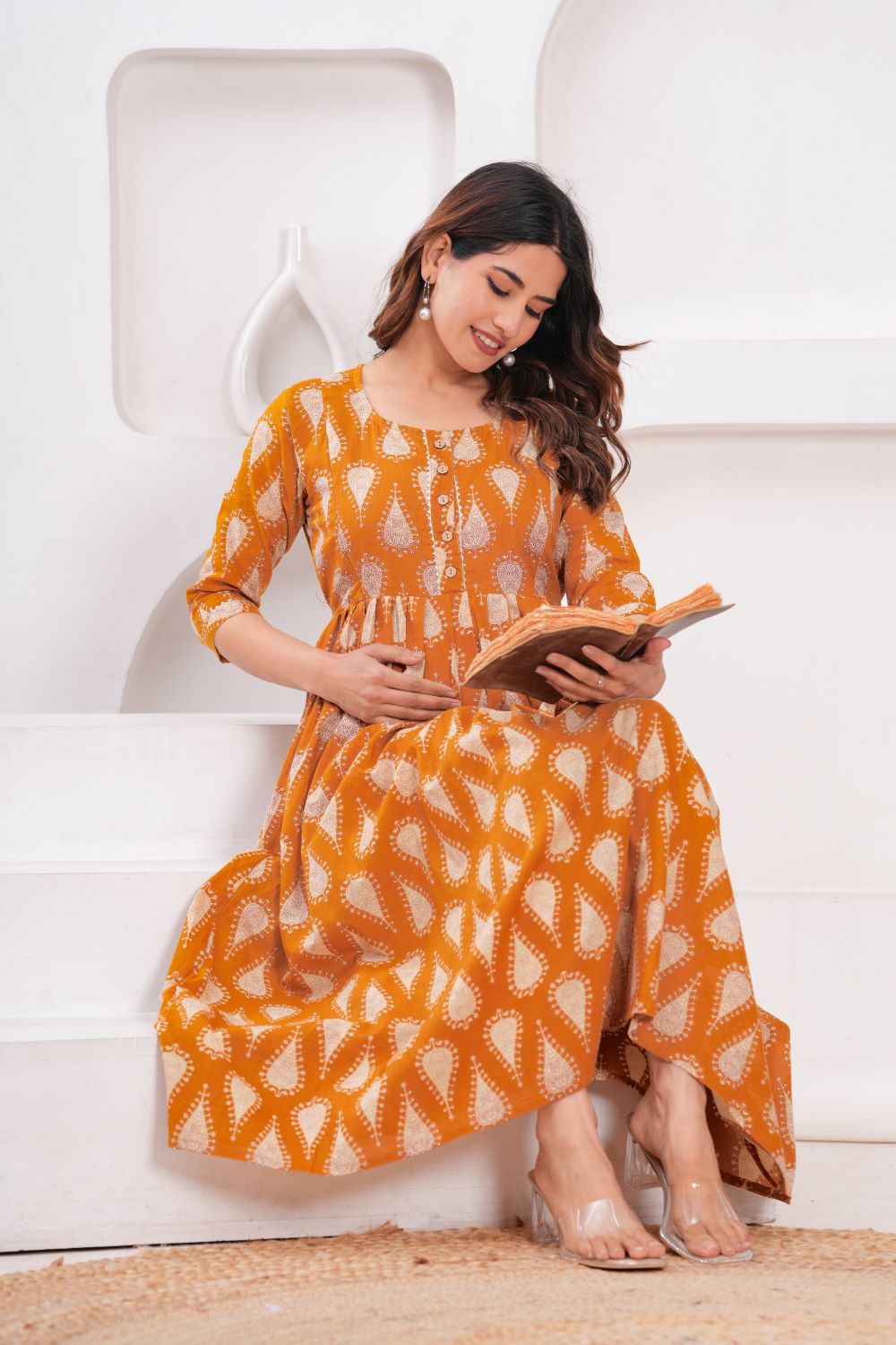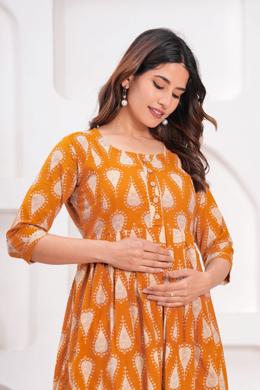 Mustard Printed Soft Cotton Maternity Gown for Baby Feeding Anarkali Kurti with Hidden Zip