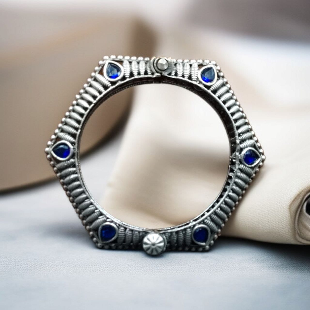 Blue Rustic Silver Oxidised Bracelet Kada Stonework Openable Free Size Kangan Bohochic Bangle