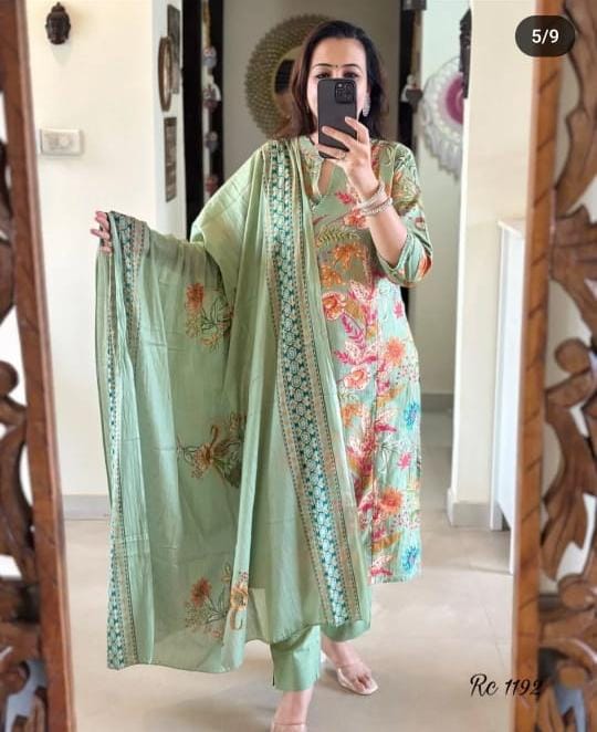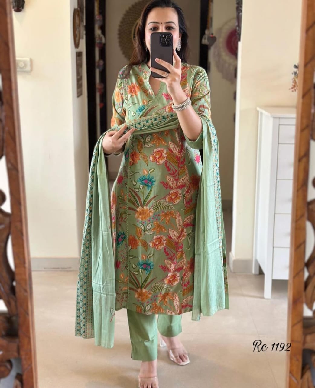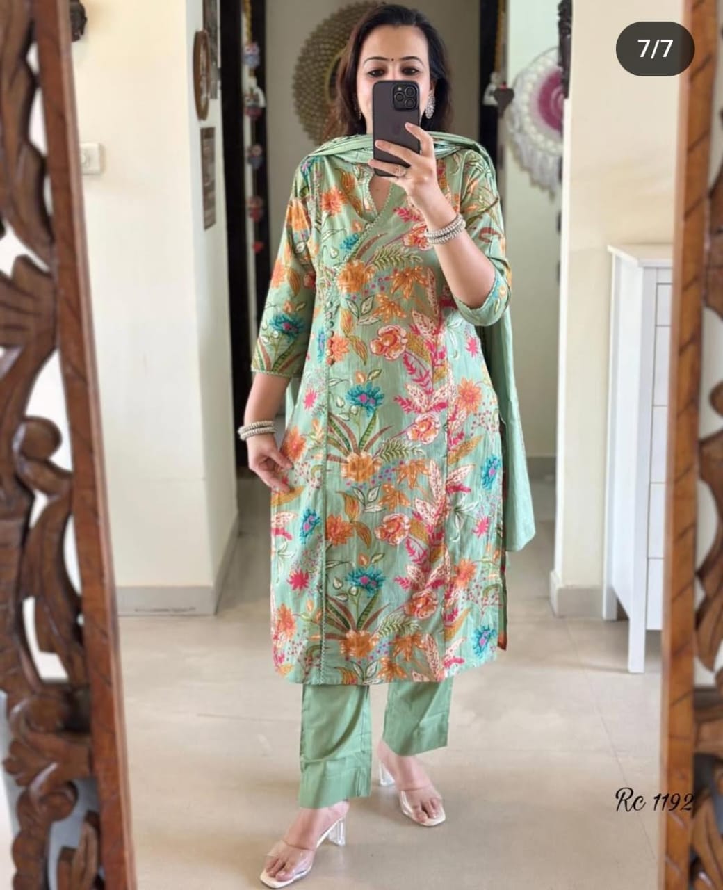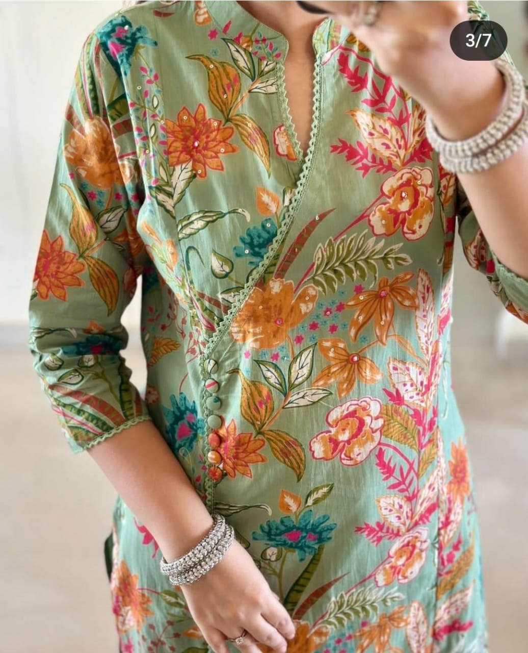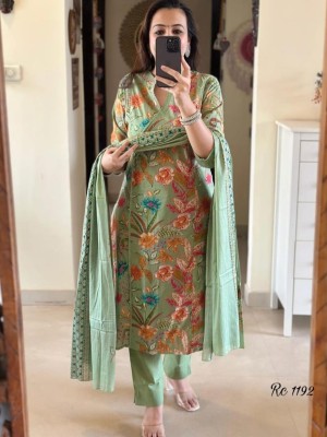Green Floral Printed Cotton Traditional Angrakha Style Straight Salwar Kameez Suit with Dupatta (Set of 3)