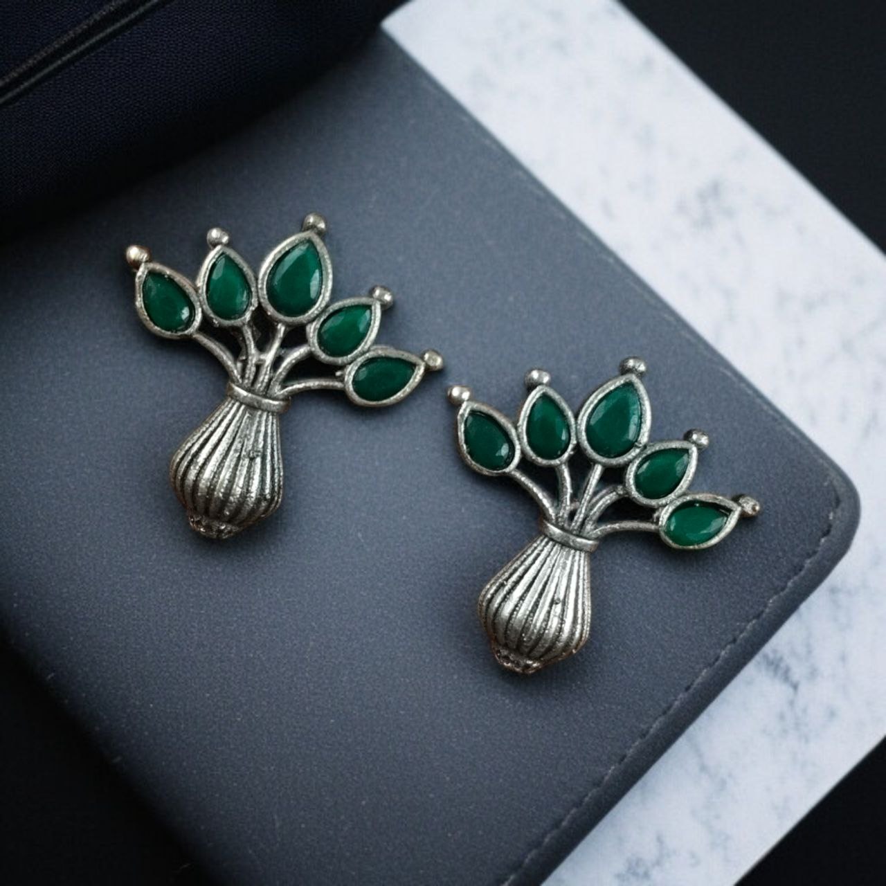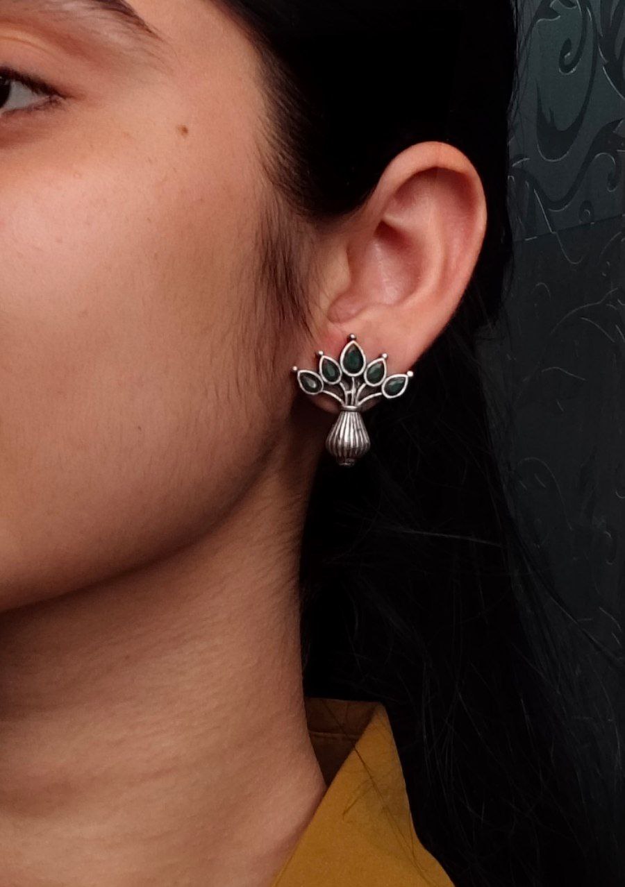 Green Gorgeous Flowerpot Earrings Designer Dailywear Stonework Silver Oxidized Stud Tops Earring Set