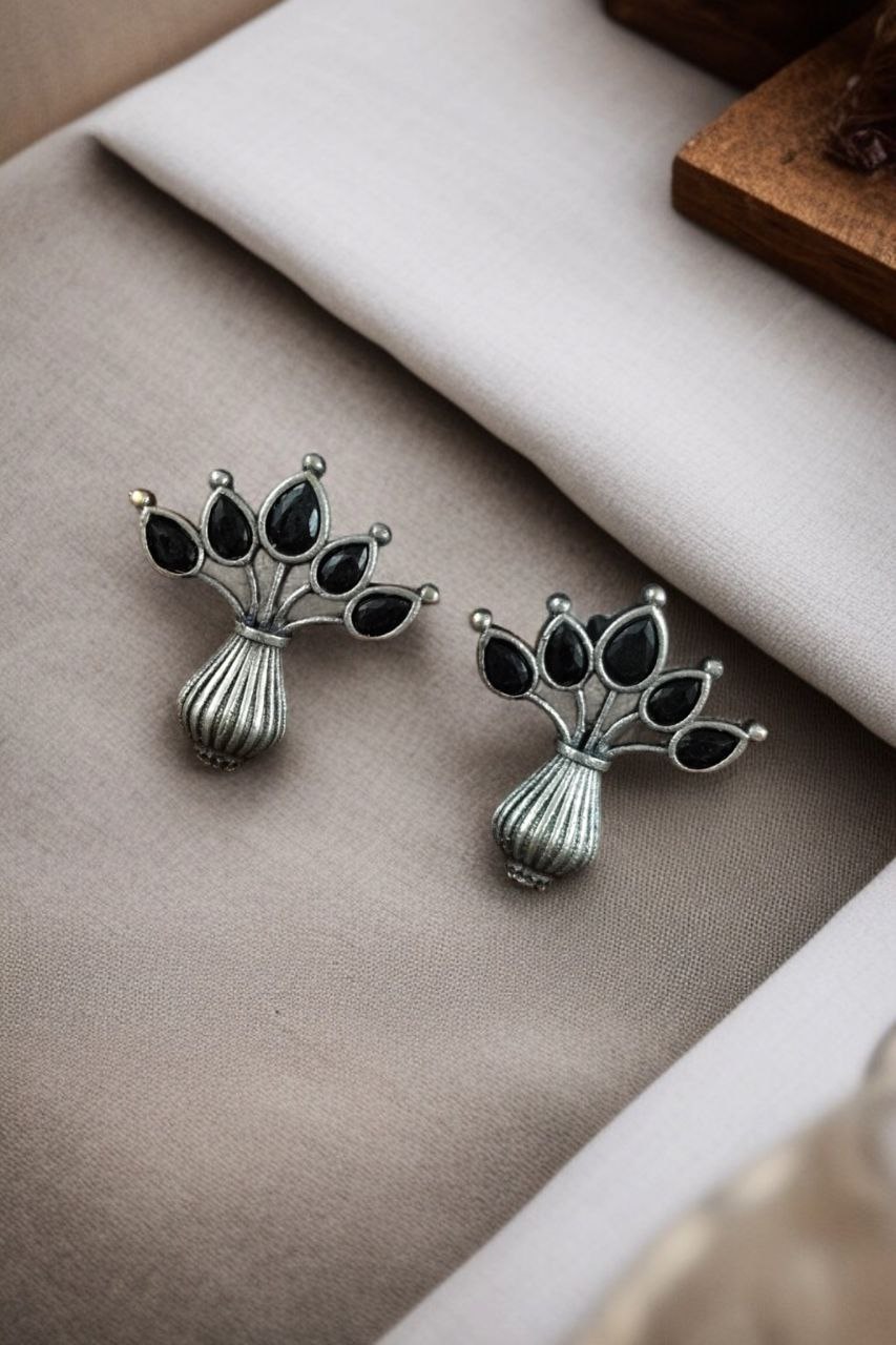 Black Gorgeous Flowerpot Earrings Designer Dailywear Stonework Silver Oxidized Stud Tops Earring Set