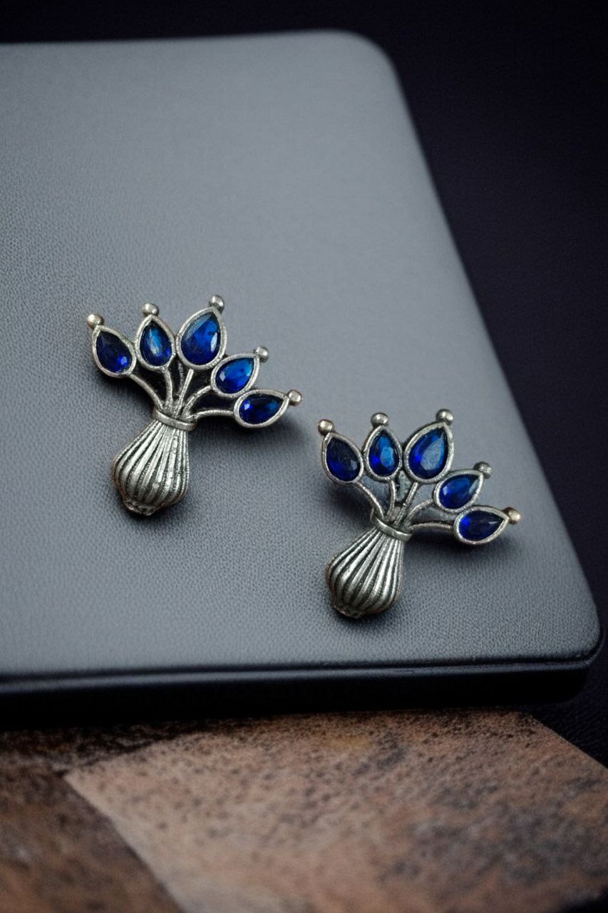 Blue Gorgeous Flowerpot Earrings Designer Dailywear Stonework Silver Oxidized Stud Tops Earring Set