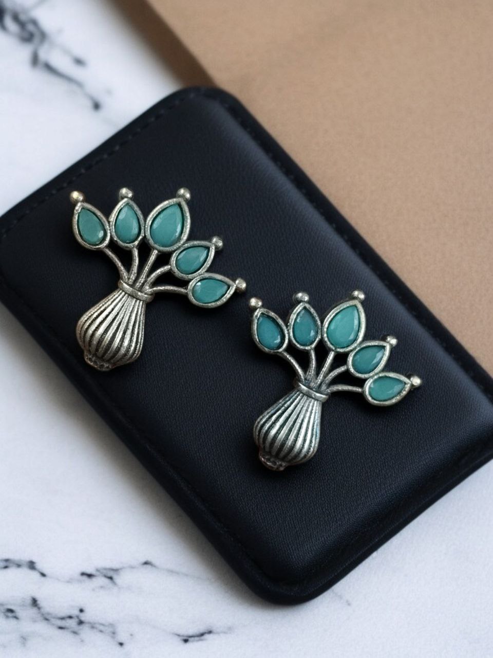 Mint Gorgeous Flowerpot Earrings Designer Dailywear Stonework Silver Oxidized Stud Tops Earring Set