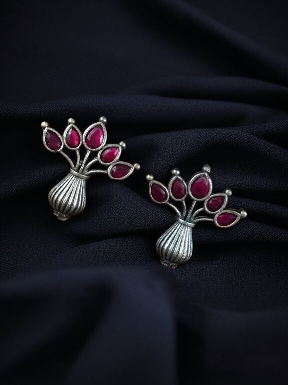 Red Gorgeous Flowerpot Earrings Designer Dailywear Stonework Silver Oxidized Stud Tops Earring Set