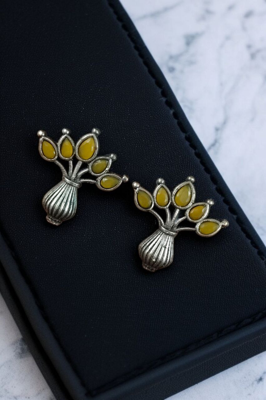 Yellow Gorgeous Flowerpot Earrings Designer Dailywear Stonework Silver Oxidized Stud Tops Earring Set