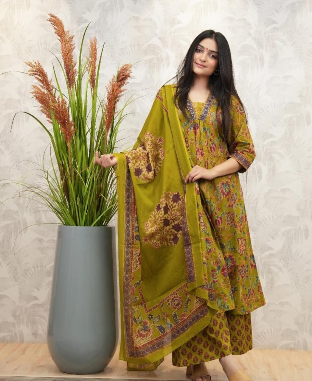 Zoya Green V-Neck Indian A-line Anarkali Salwar Kameez Kurti Palazzo Pant Dupatta Set for Women