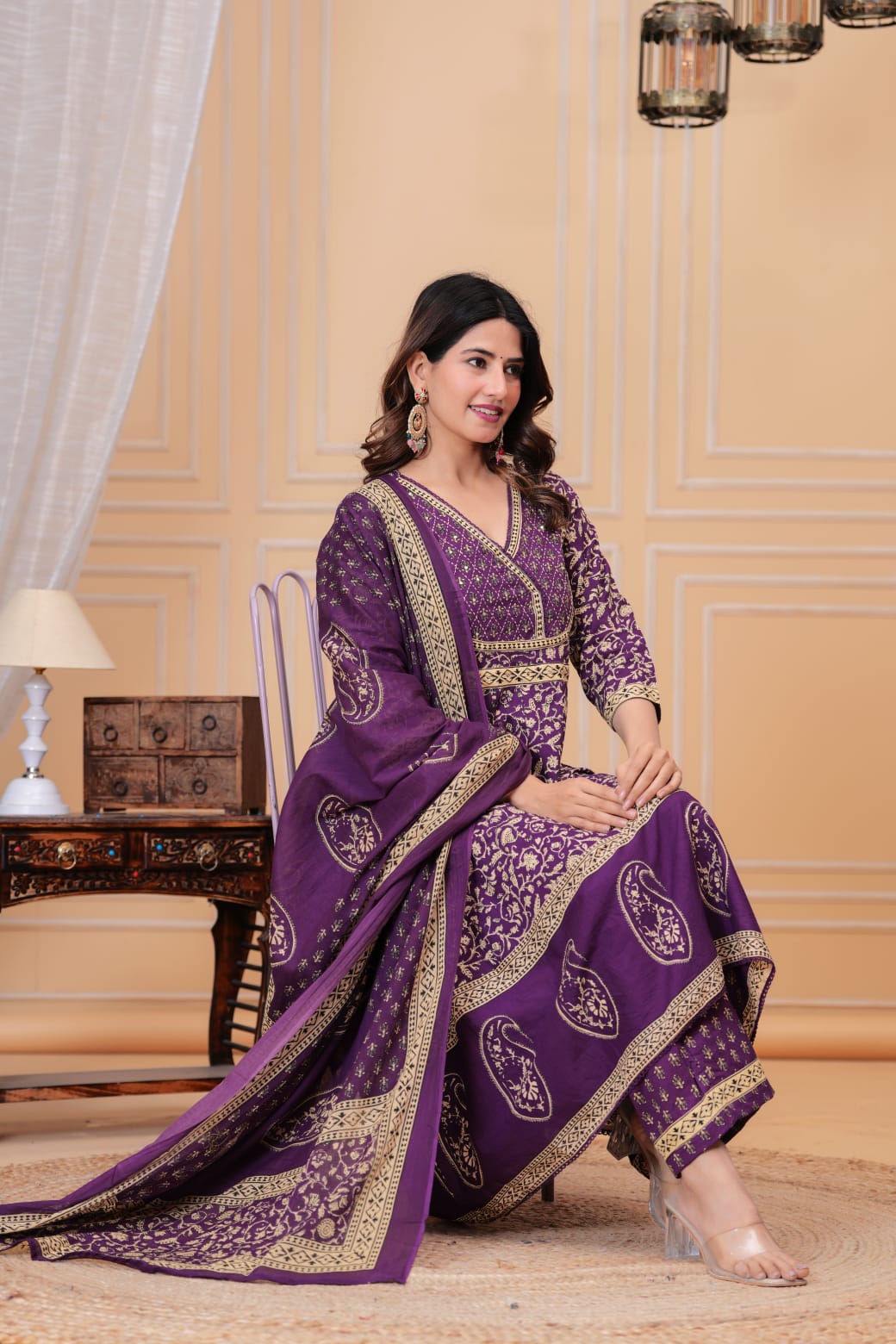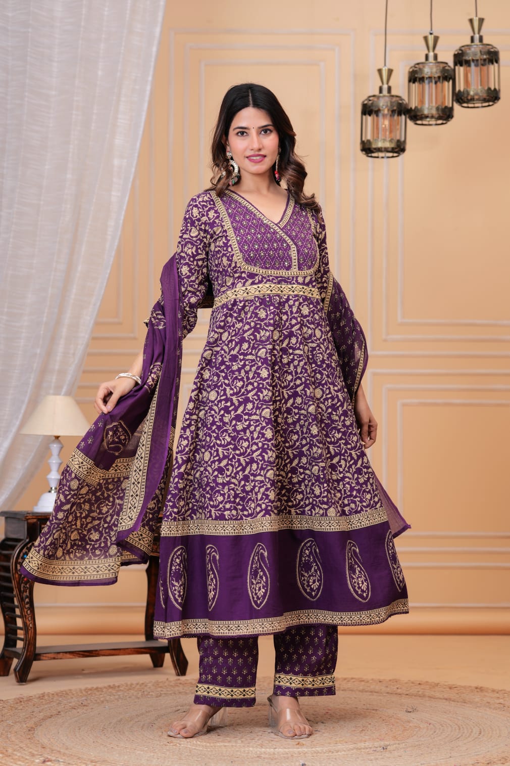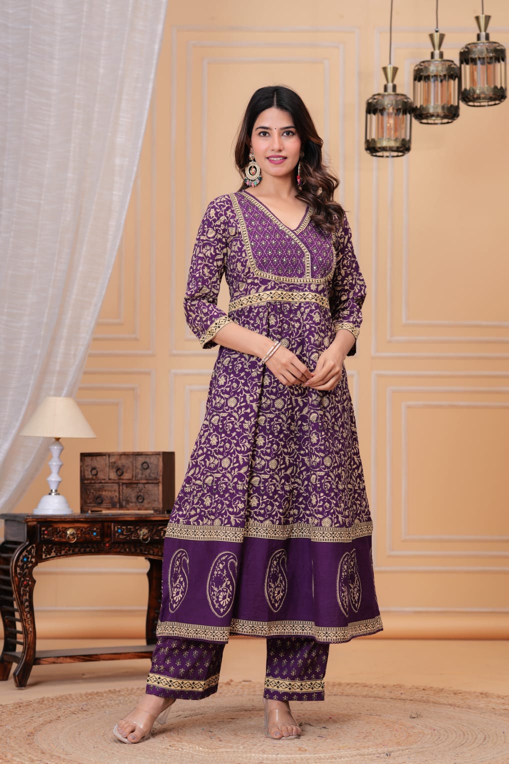 This elegant Anarkali kurta set features a beautiful purple floral hand block print, perfect for adding a touch of traditional style to any wardrobe. Made from comfortable cotton fabric, this set includes a flared kurta, matching pants, and a dupatta. Ideal for both casual and festive occasions, this outfit offers a blend of style and comfort. The intricate design and vibrant color make it a standout piece, ensuring you look and feel your best.