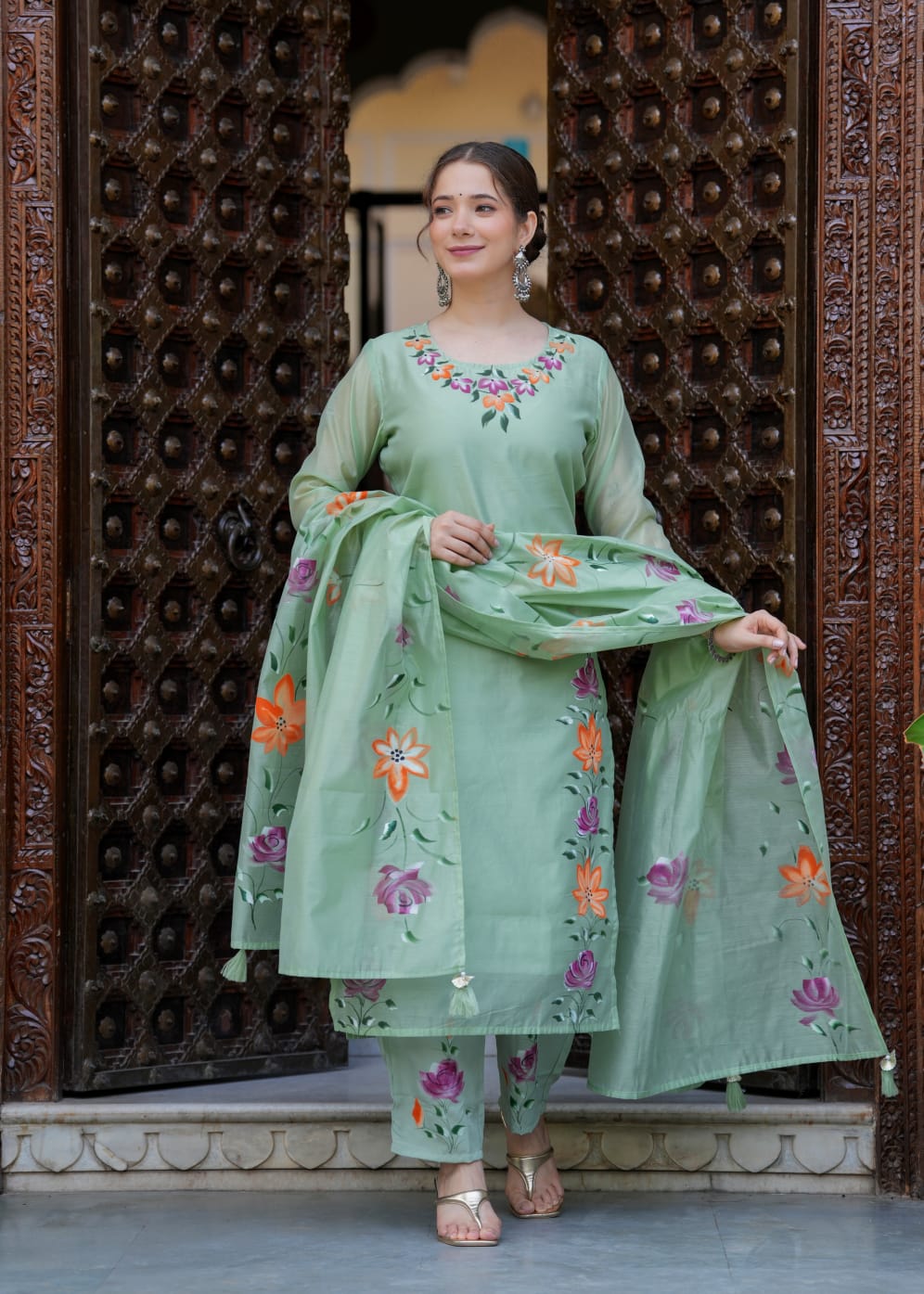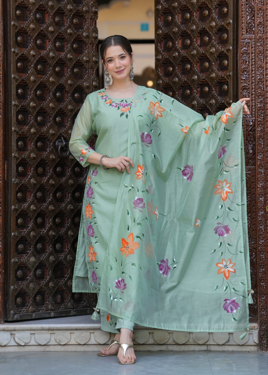 This Light Green Brush Printed Straight Salwar Kameez Kurti Pant Dupatta Set for Women is a perfect blend of comfort and style. Crafted from soft Silk, the straight-cut kurti features elegant brush prints that add a touch of sophistication. The matching cotton pants and chanderi dupatta complete the ensemble, making it ideal for casual outings or relaxed occasions. With its lightweight fabric and flattering design, this set promises both comfort and timeless appeal for every woman.