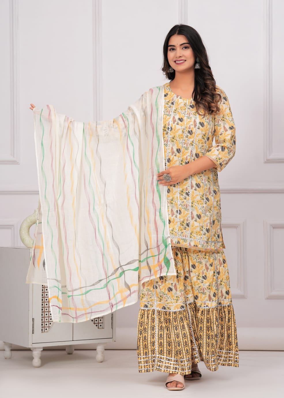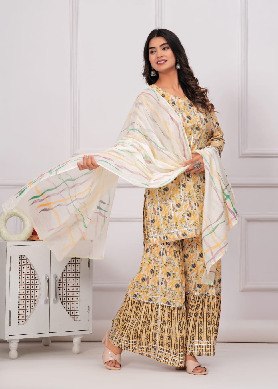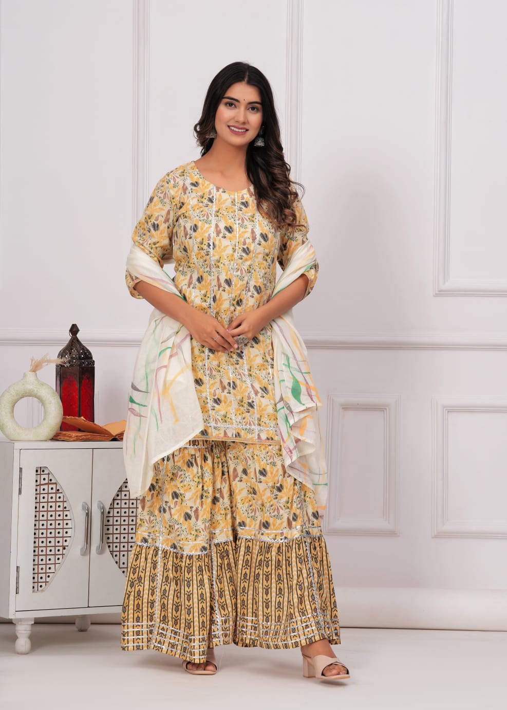 Yellow Readymade Floral Print Cotton Kurti Sharara Dupatta Designer Salwar Kameez Suit Set