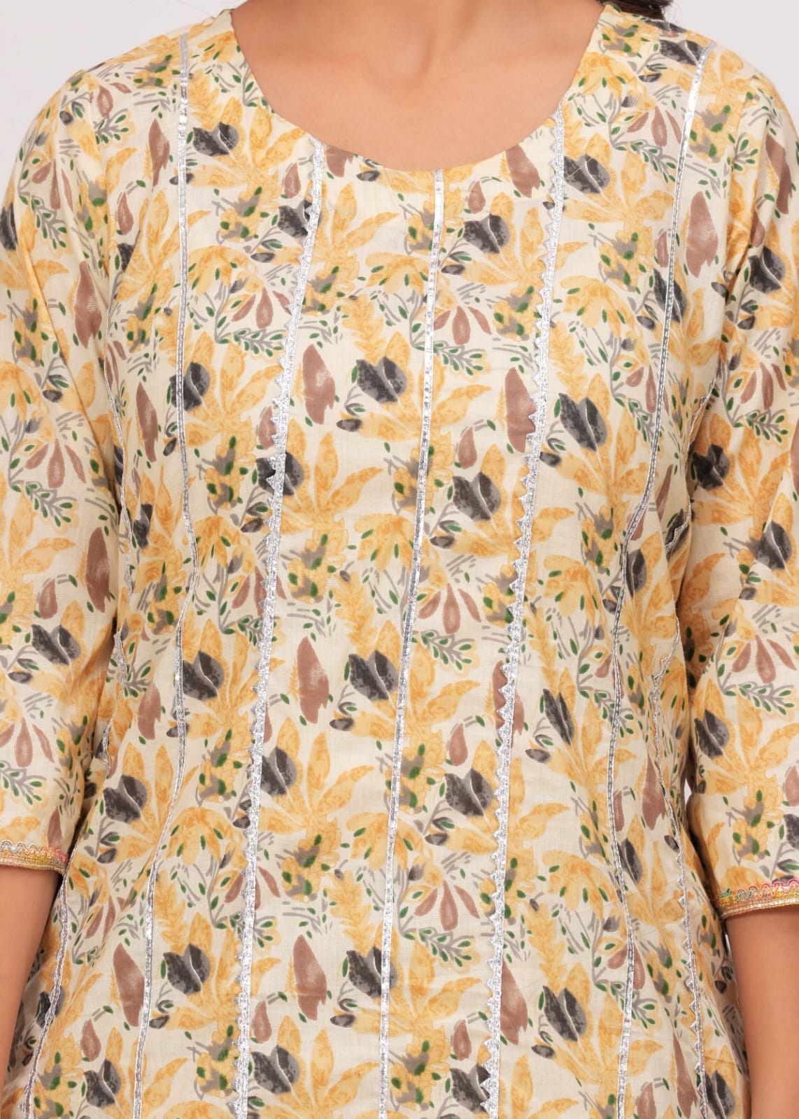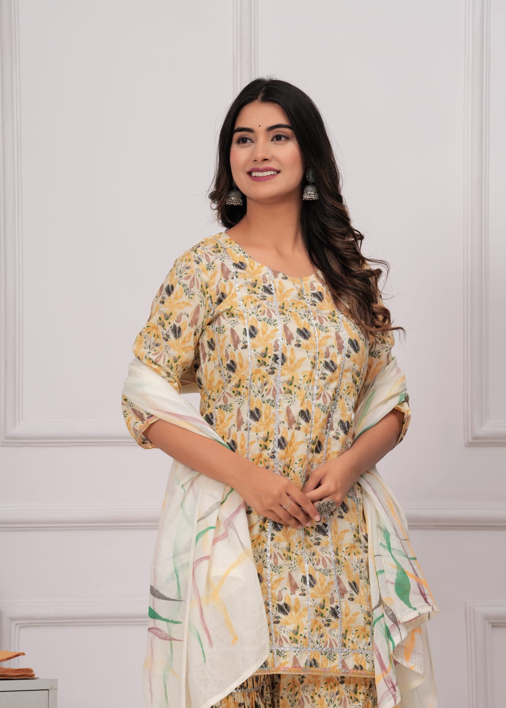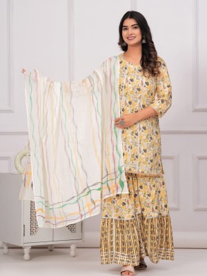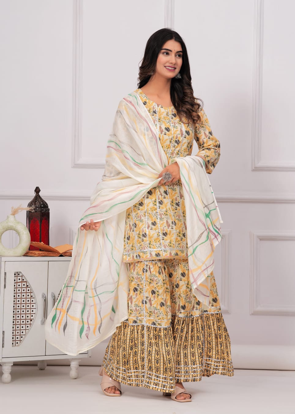 Yellow Readymade Floral Print Cotton Kurti Sharara Dupatta Designer Salwar Kameez Suit Set
