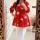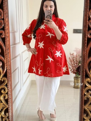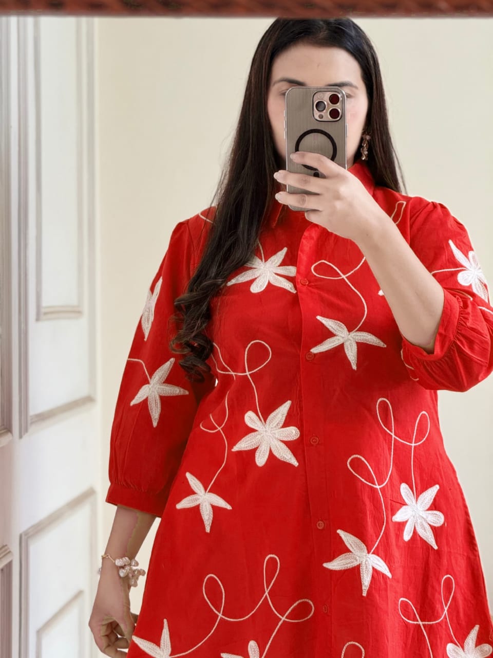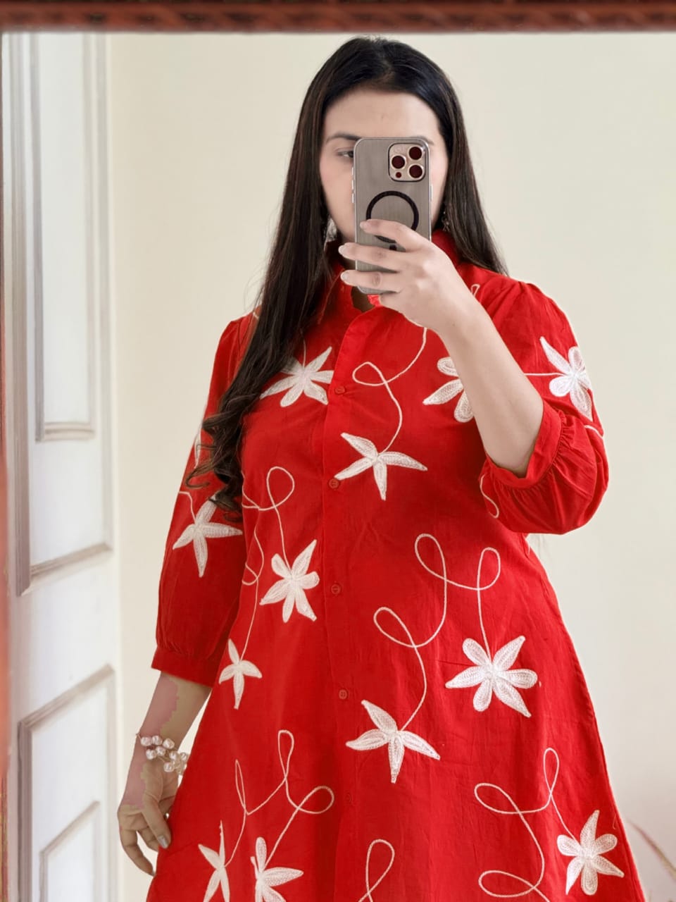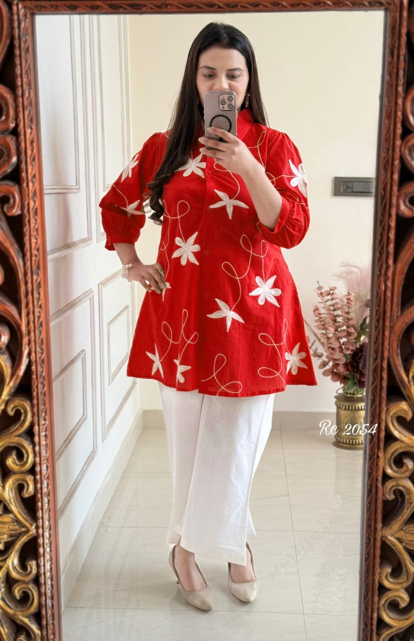 Red Floral Embroidered Cotton Collared Short Button Kurti Top Pant Set
