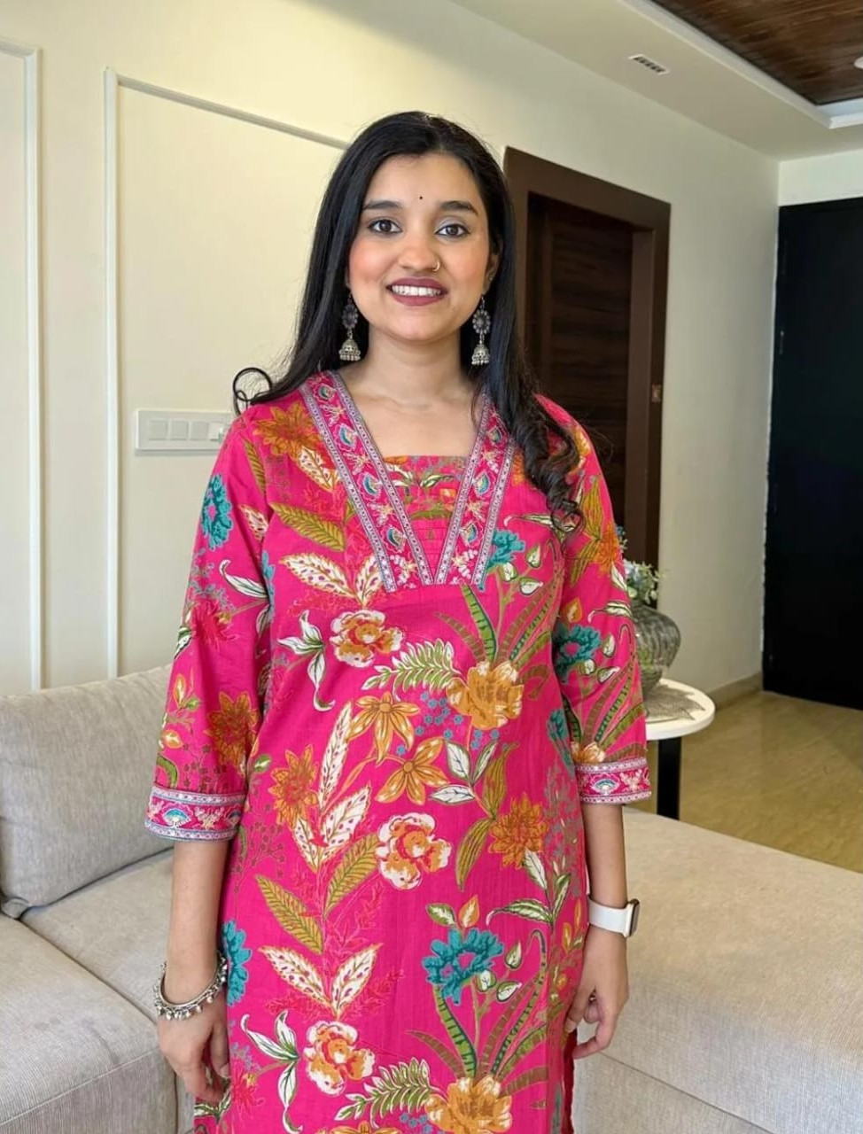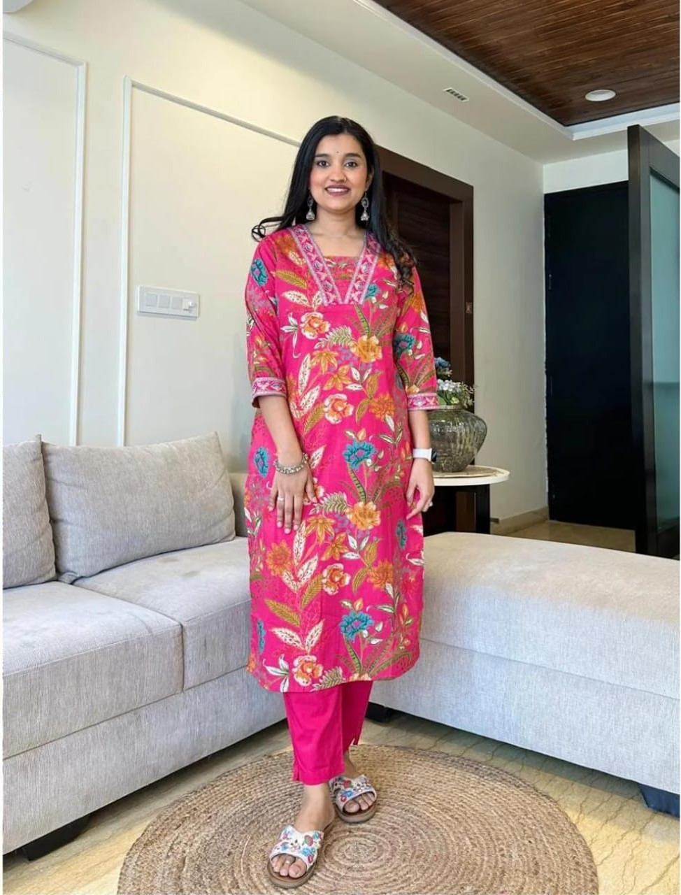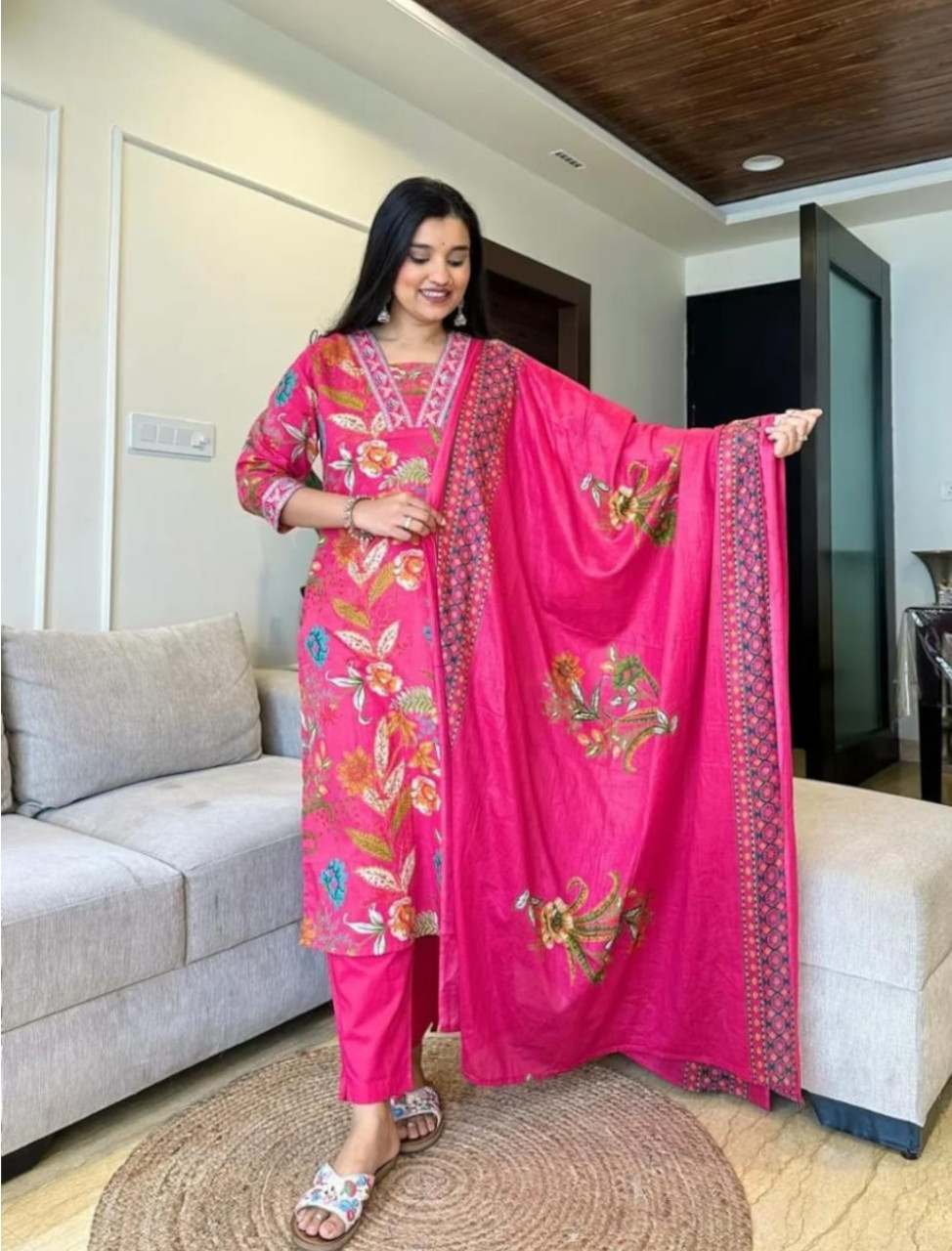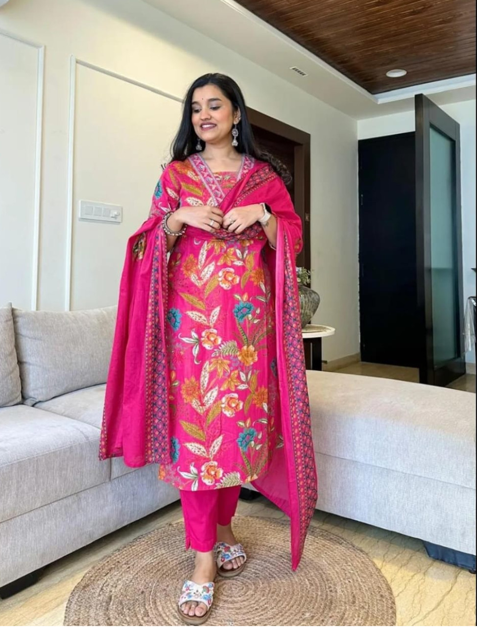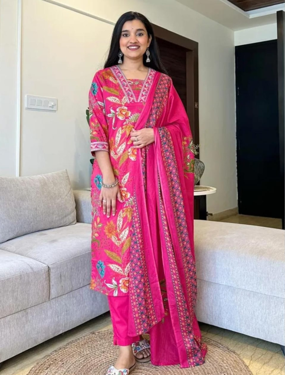 This Pink Floral Printed Cotton Straight Salwar Kameez Kurti Pant Dupatta Set for Women is a perfect blend of comfort and style. Crafted from soft, breathable cotton, the straight-cut kurti features elegant prints that add a touch of sophistication. The matching pants and dupatta complete the ensemble, making it ideal for casual outings or relaxed occasions. With its lightweight fabric and flattering design, this set promises both comfort and timeless appeal for every woman.