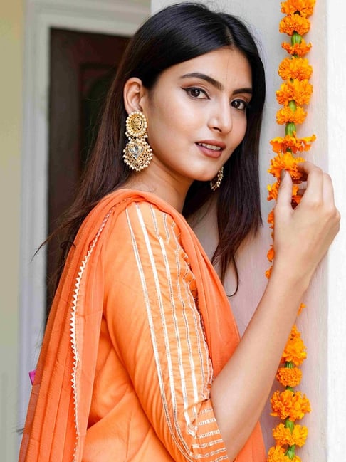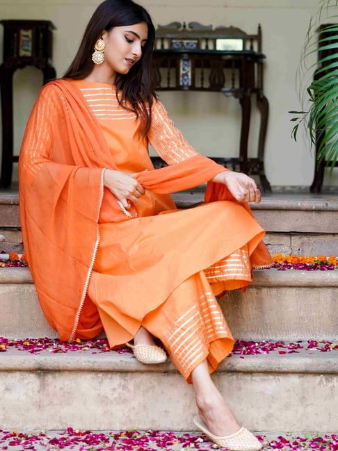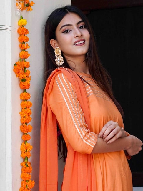 Enhance your ethnic collection with our Orange Rayon Straight Kurti Pant Dupatta Set having Beautiful Gota Work. This Indian salwar kameez dress features a charming soft, breathable rayon fabric, offering both elegance and comfort. The straight-cut kurti is paired with matching pants and a lightweight chiffon dupatta, creating a cohesive, stylish look. Perfect for festive occasions, casual outings, or daily wear, its vibrant hue adds a lively touch. Pair it with delicate jewelry and sandals for an effortlessly graceful appearance.
