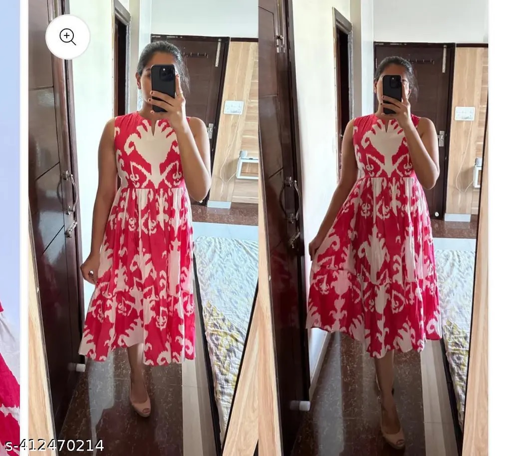 Pink Ikat Printed Cotton Midi Sleeveless  Kurti Dress For Women