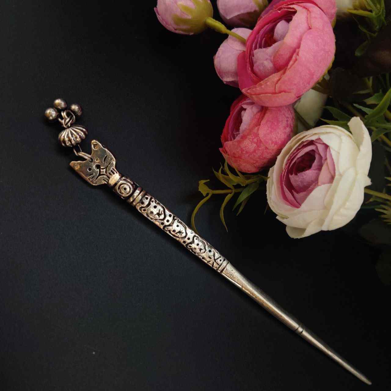Stylish Designer Cat Hair Pin Bun Holder Silver-Plated Handmade Hair Stick Hair Jewelry for Women