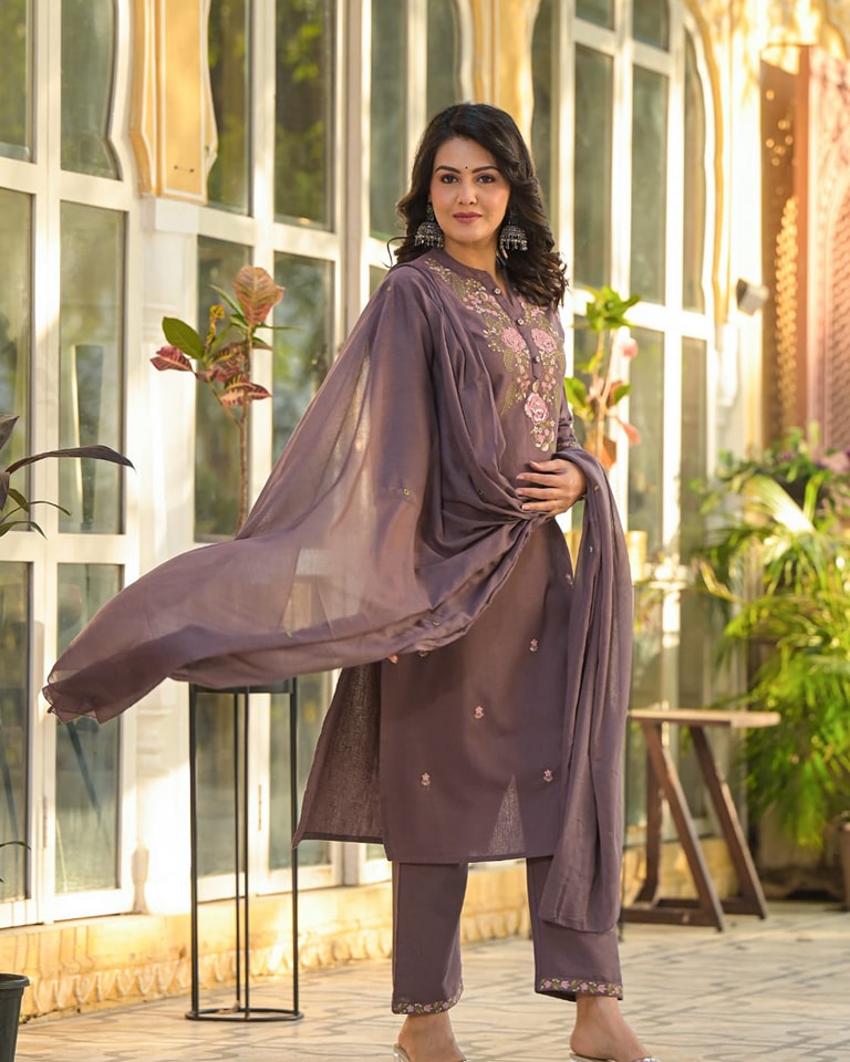 Discover elegance with this Purple Floral Embroidered Indian Straight Salwar Kameez Kurti Pant Dupatta Set for Women. The kurti features intricate Embroidery and floral designs that add a touch of sophistication. Made from high-quality cotton fabric, it ensures comfort and style. Perfect for festive occasions or casual outings, this set combines traditional charm with contemporary elegance.