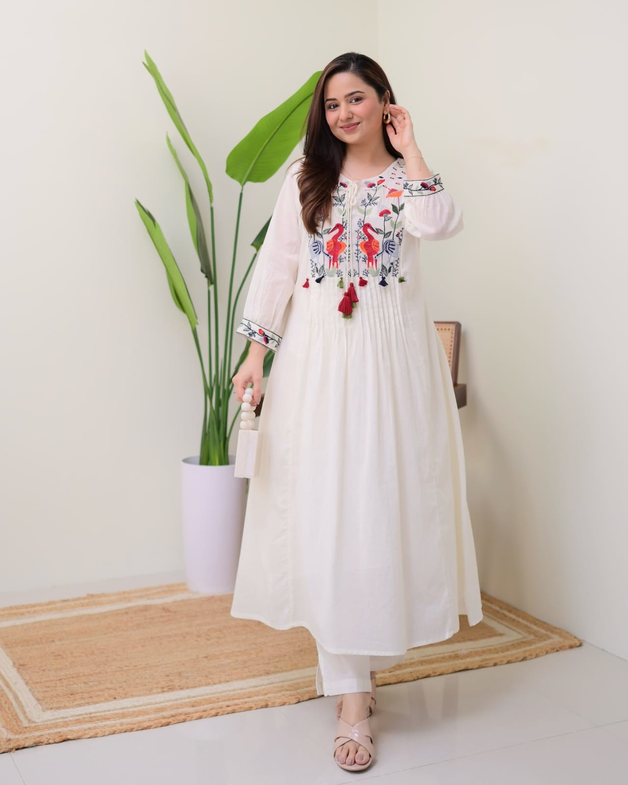 White Embroidered A-line Anarkali Kurta Kurti Pant Co Ord Set Cotton Salwar Kameez Dress (Set of 2)