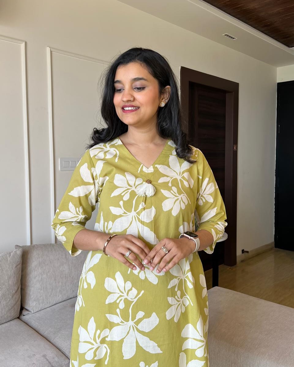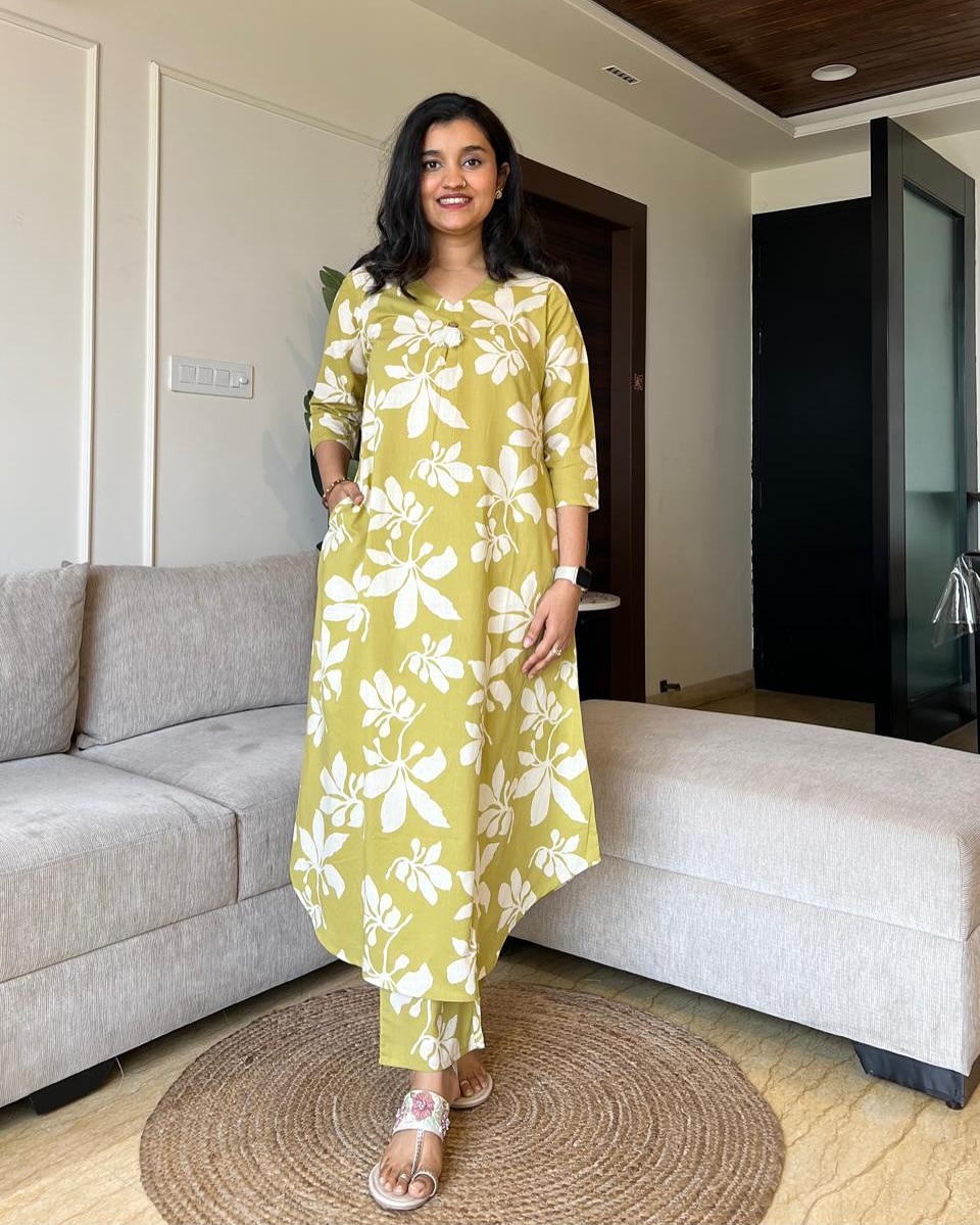 Green Floral Print Casual Wear Kurta Pant Cotton Co-Ord Set For Women (Set of 2)