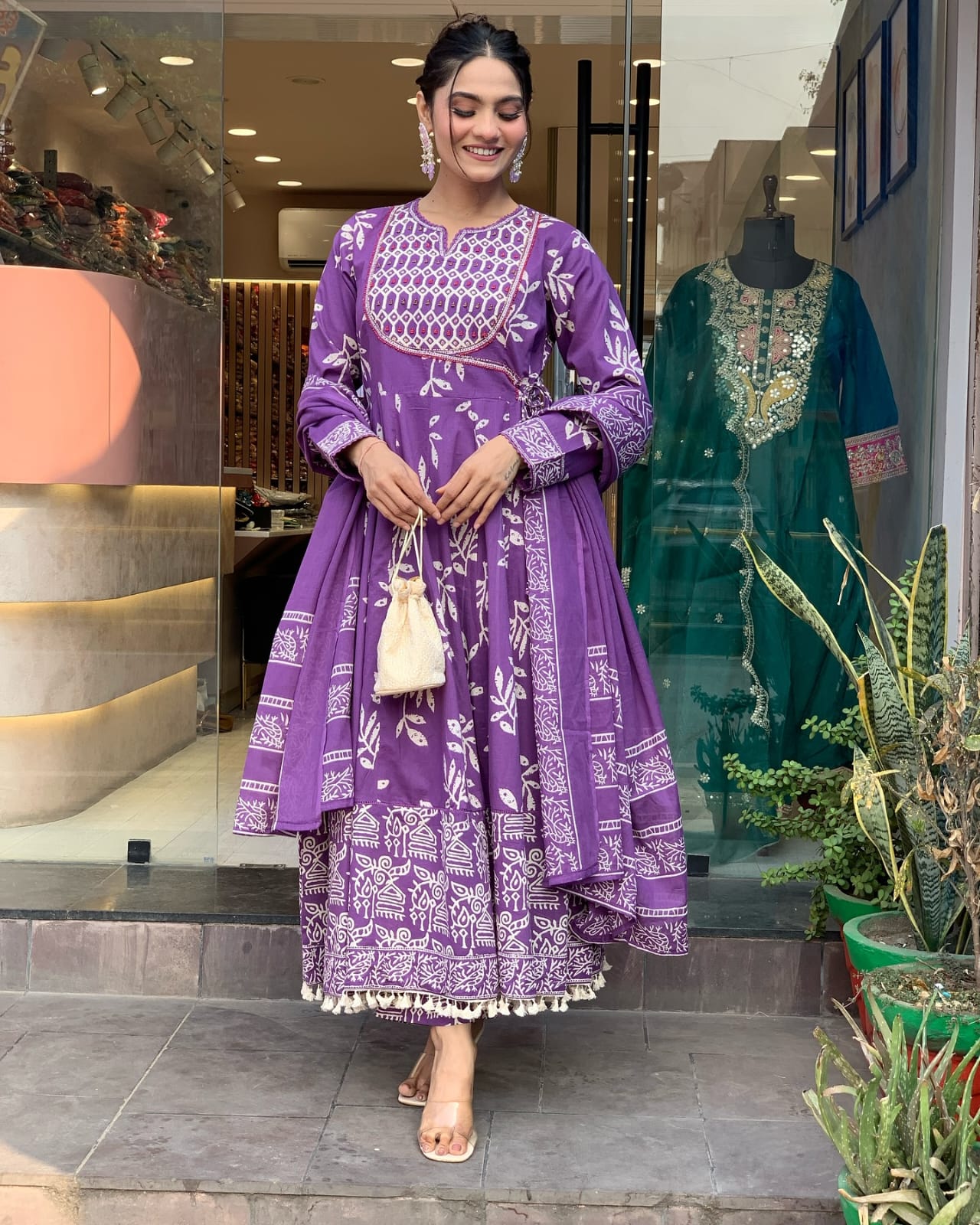 Elevate your ethnic style with this Printed Anarkali Flare Style Kurti Pant Dupatta Set, crafted from soft, breathable cotton. The elegant Anarkali kurti features beautiful prints, paired with comfortable pants and a matching dupatta for a complete look. Perfect for casual wear, festive gatherings, or daily elegance, this cotton salwar kameez suit offers both comfort and charm. Shop this timeless outfit online and embrace effortless traditional style.