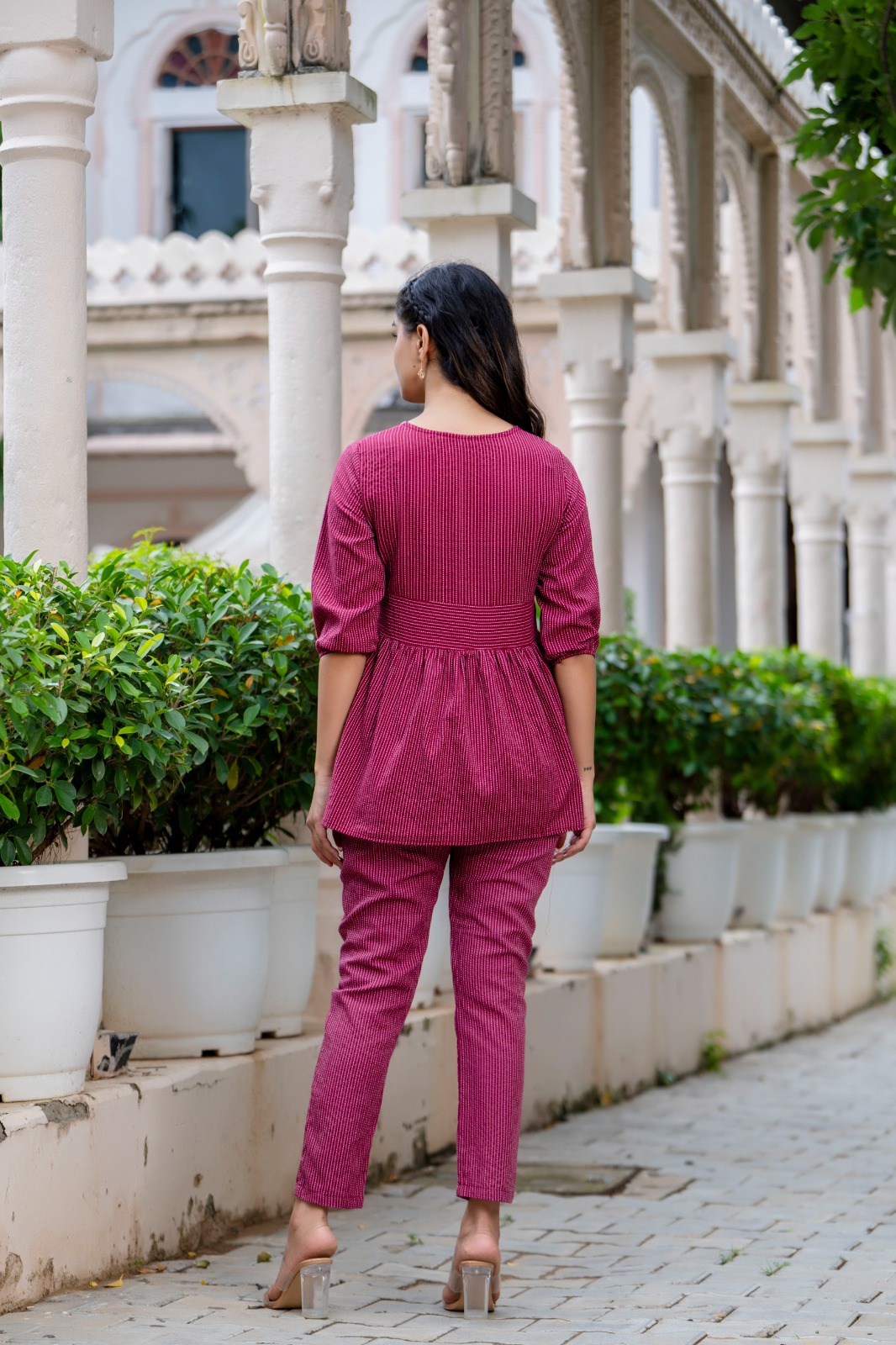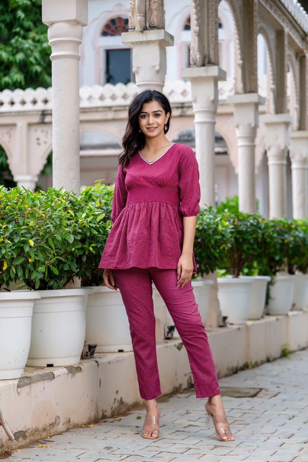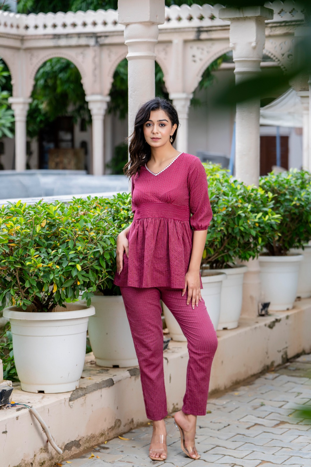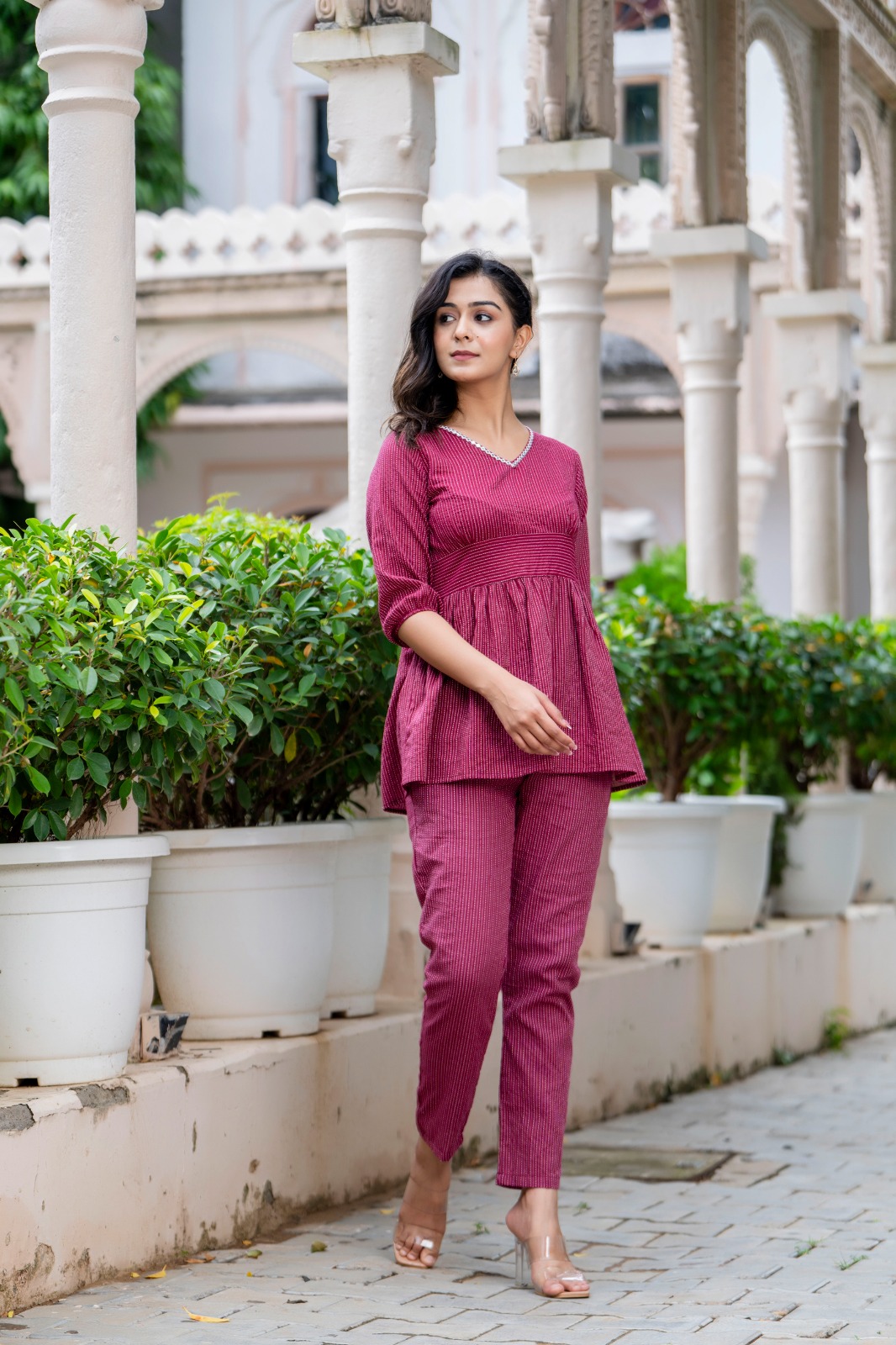 Maroon Cotton V-Neck Co Ord Set Salwar Kameez Suit Short Kurti Pant Combo