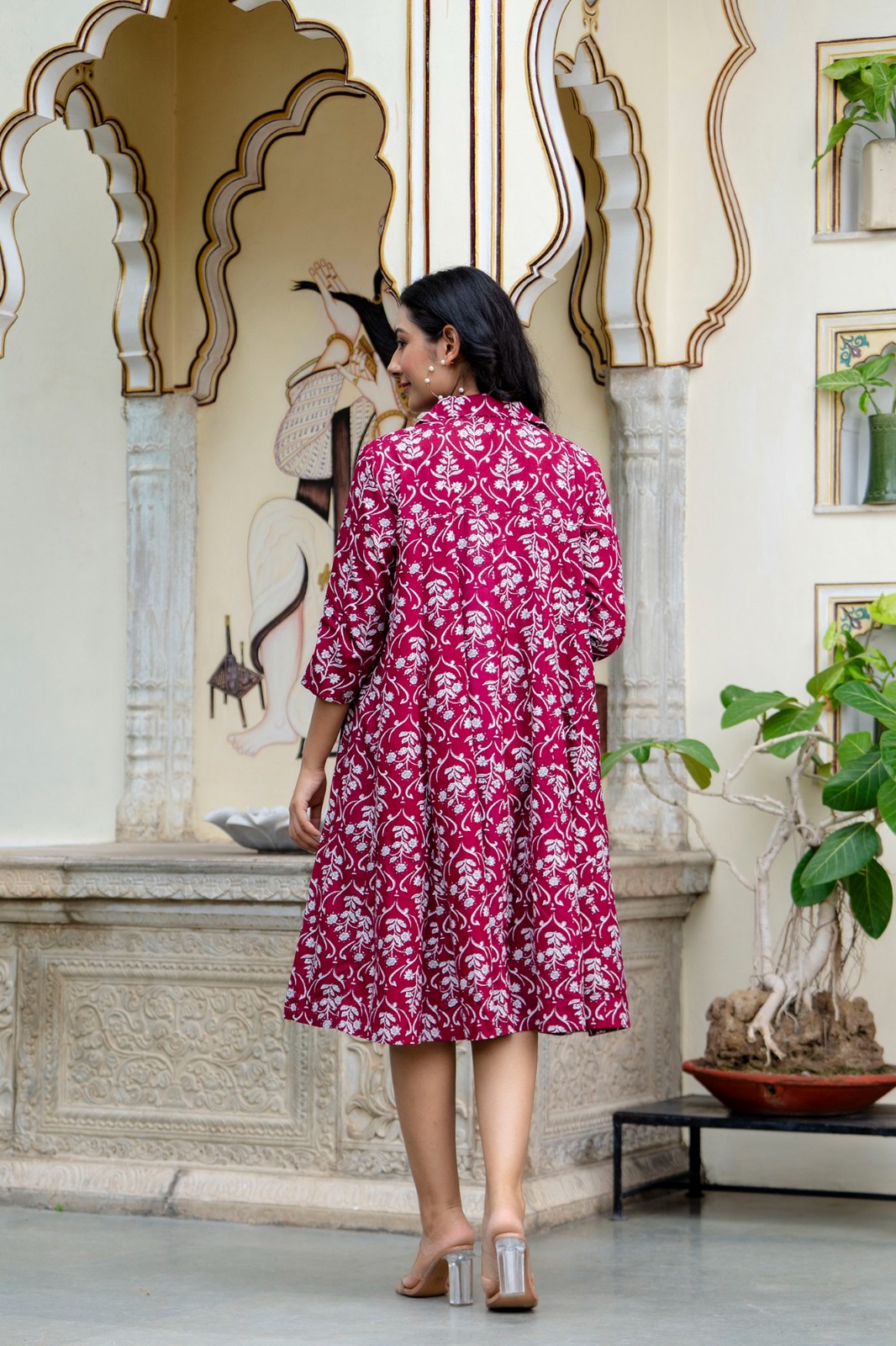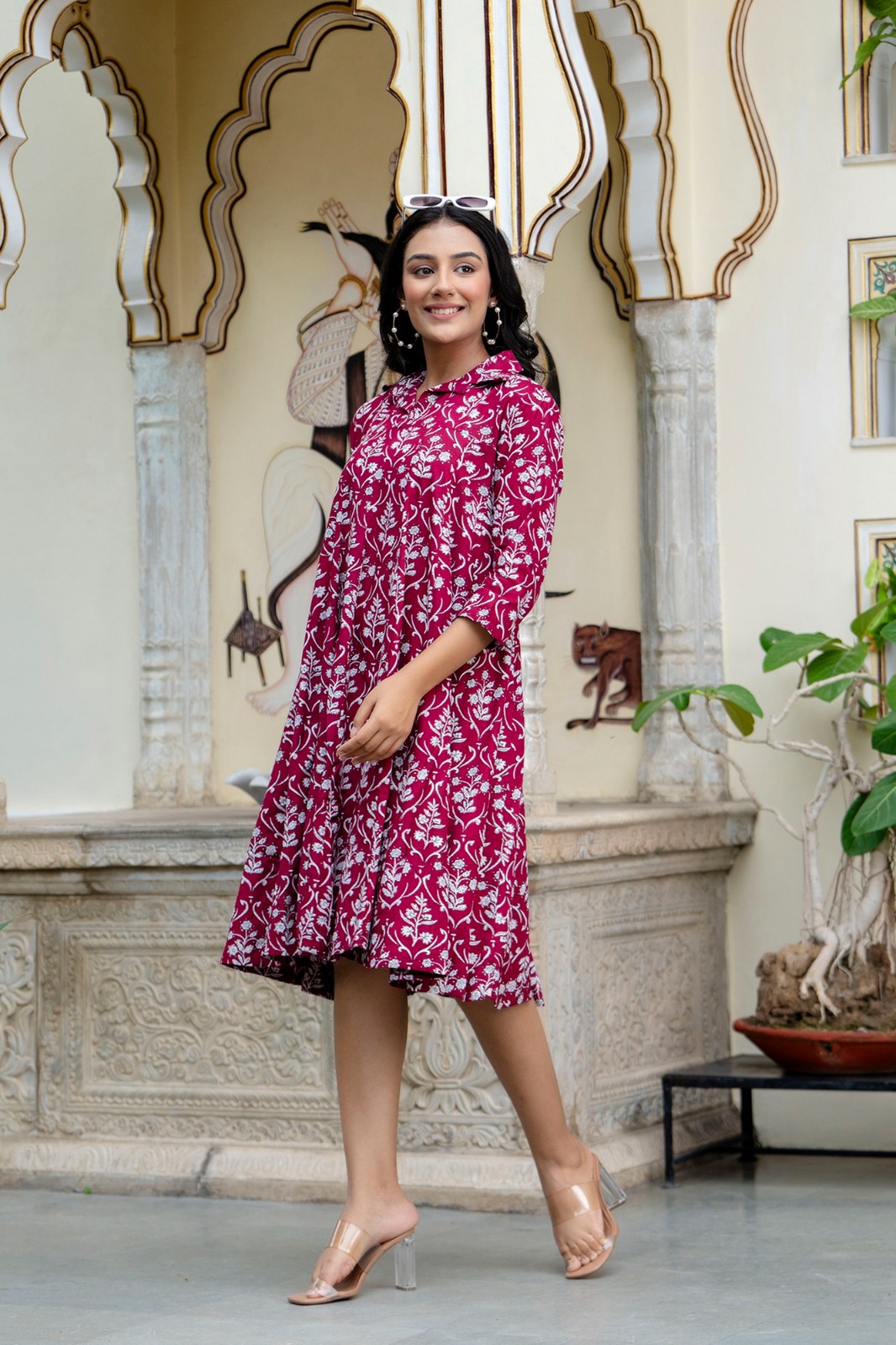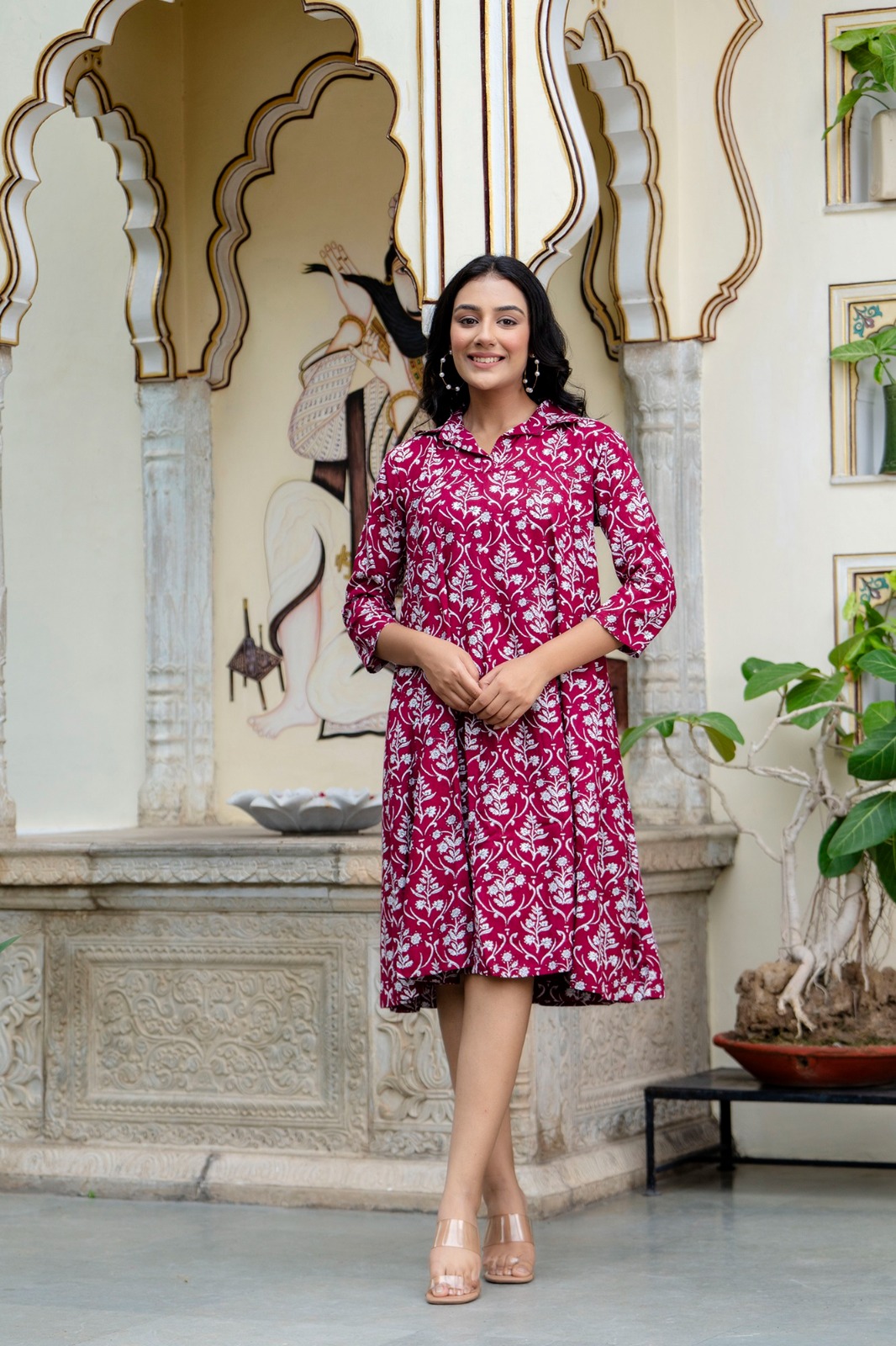 Maroon Printed Fit & Flare Collared Kurti Midi Dress for Women