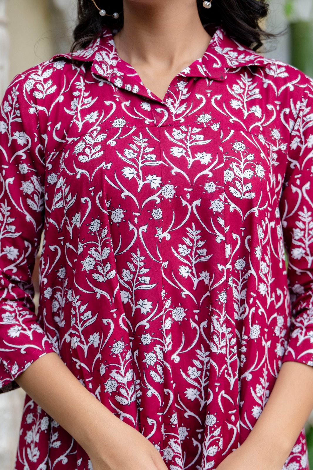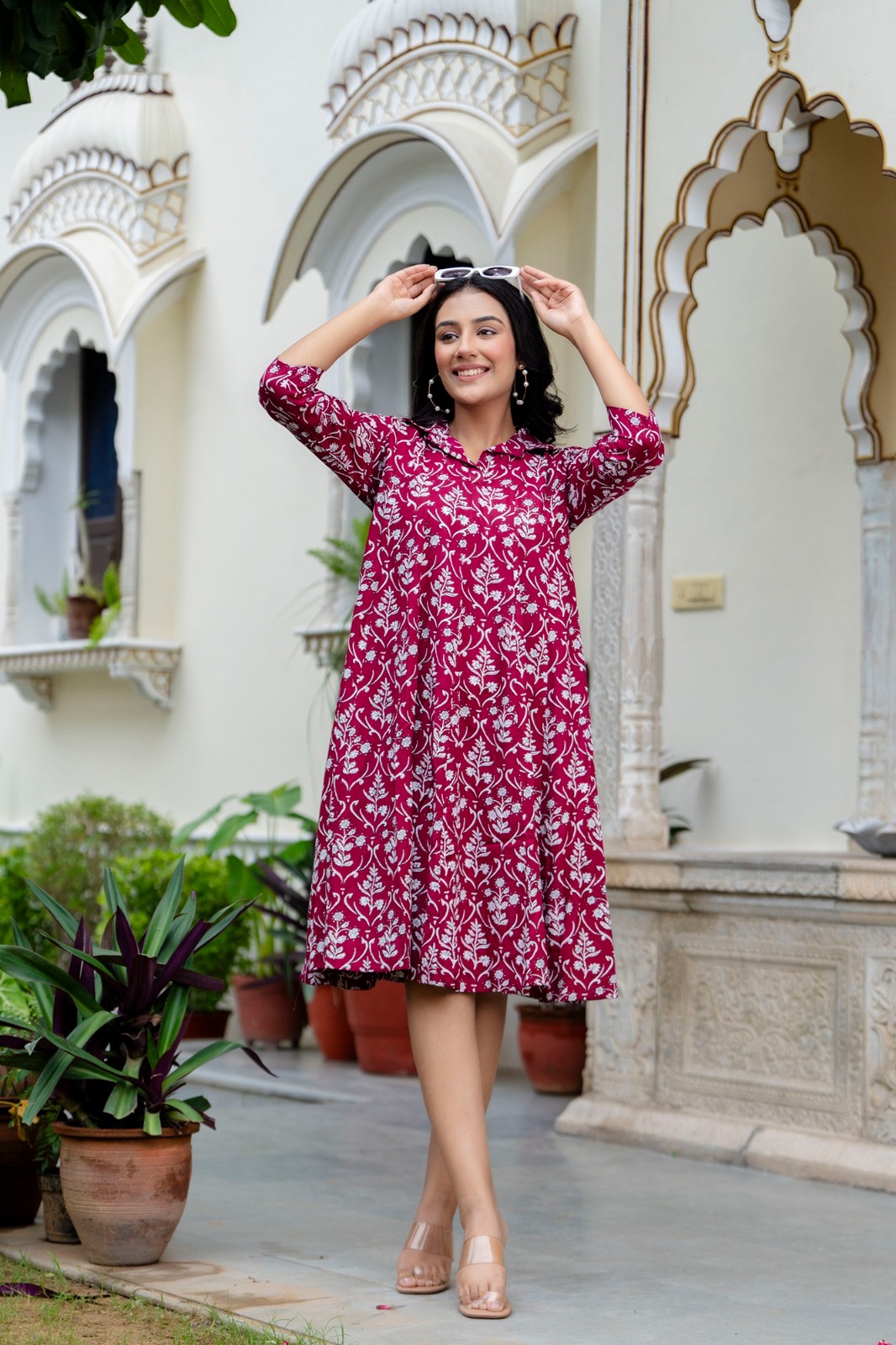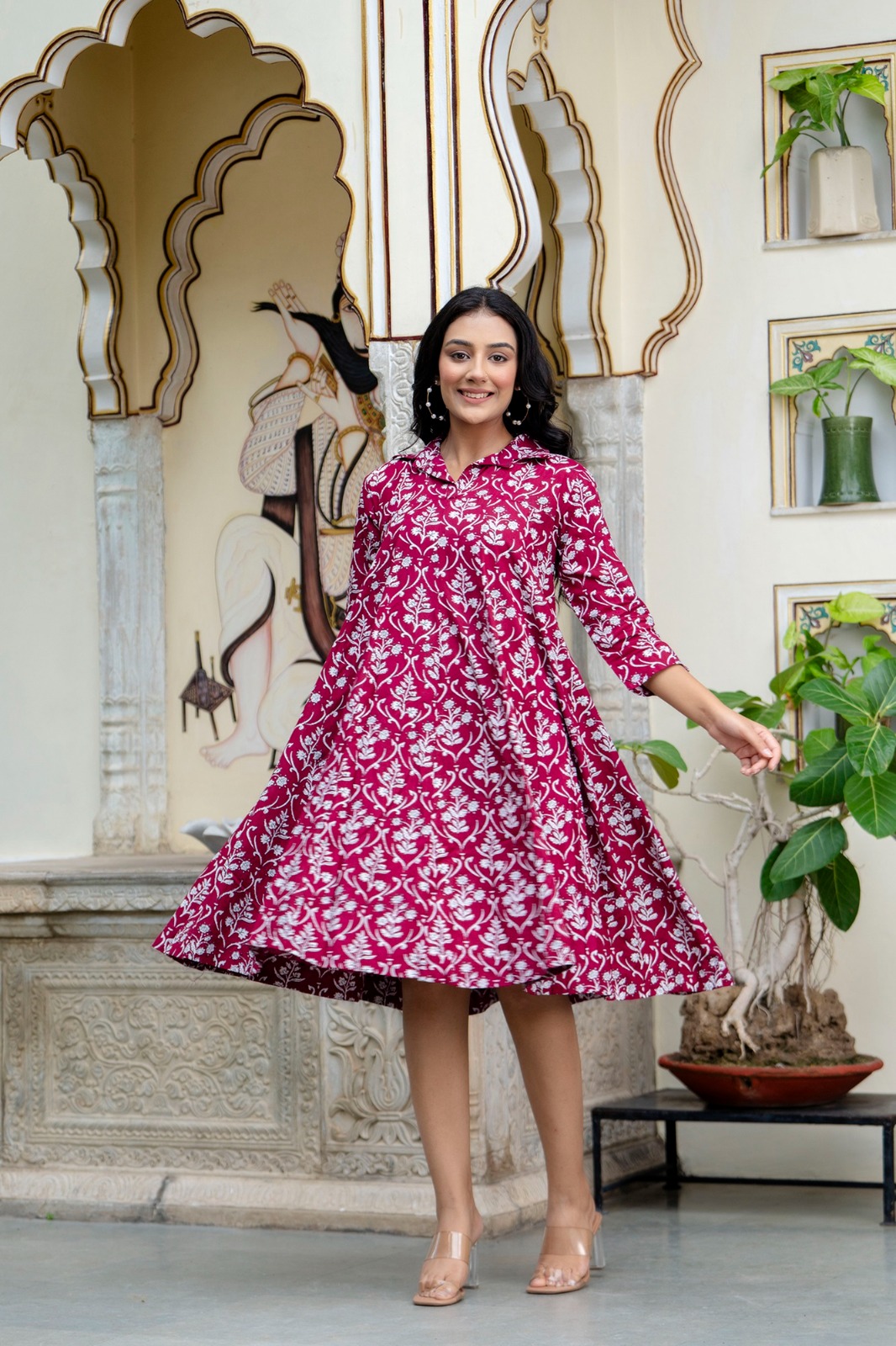 Maroon Printed Fit & Flare Collared Kurti Midi Dress for Women
