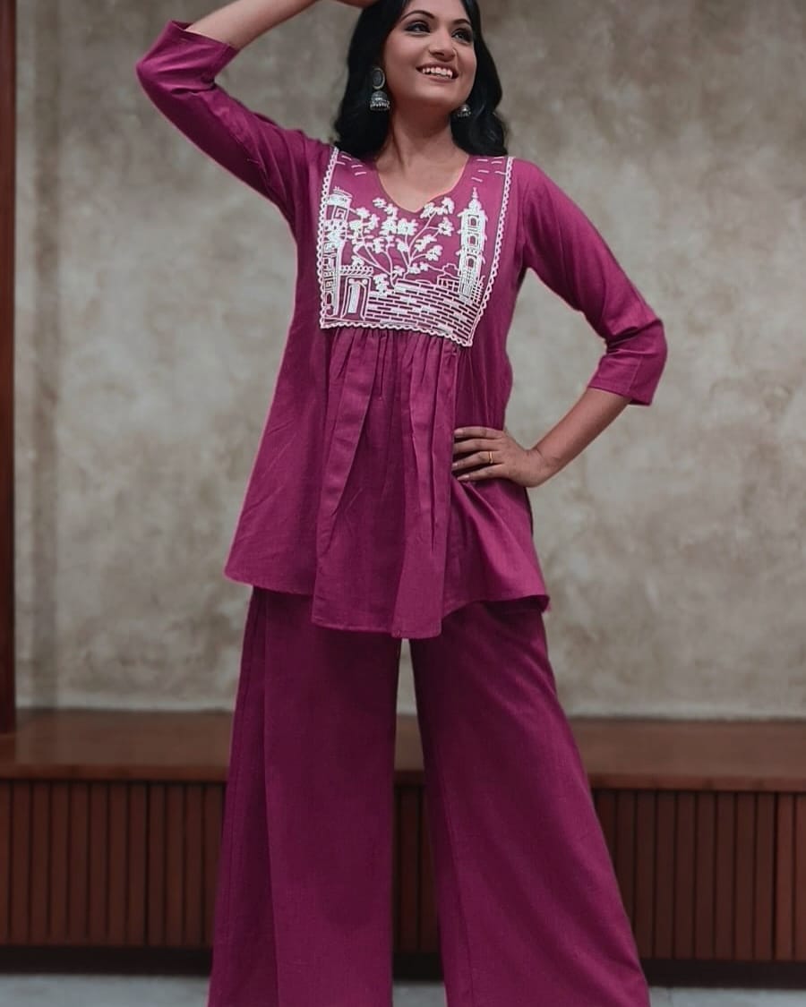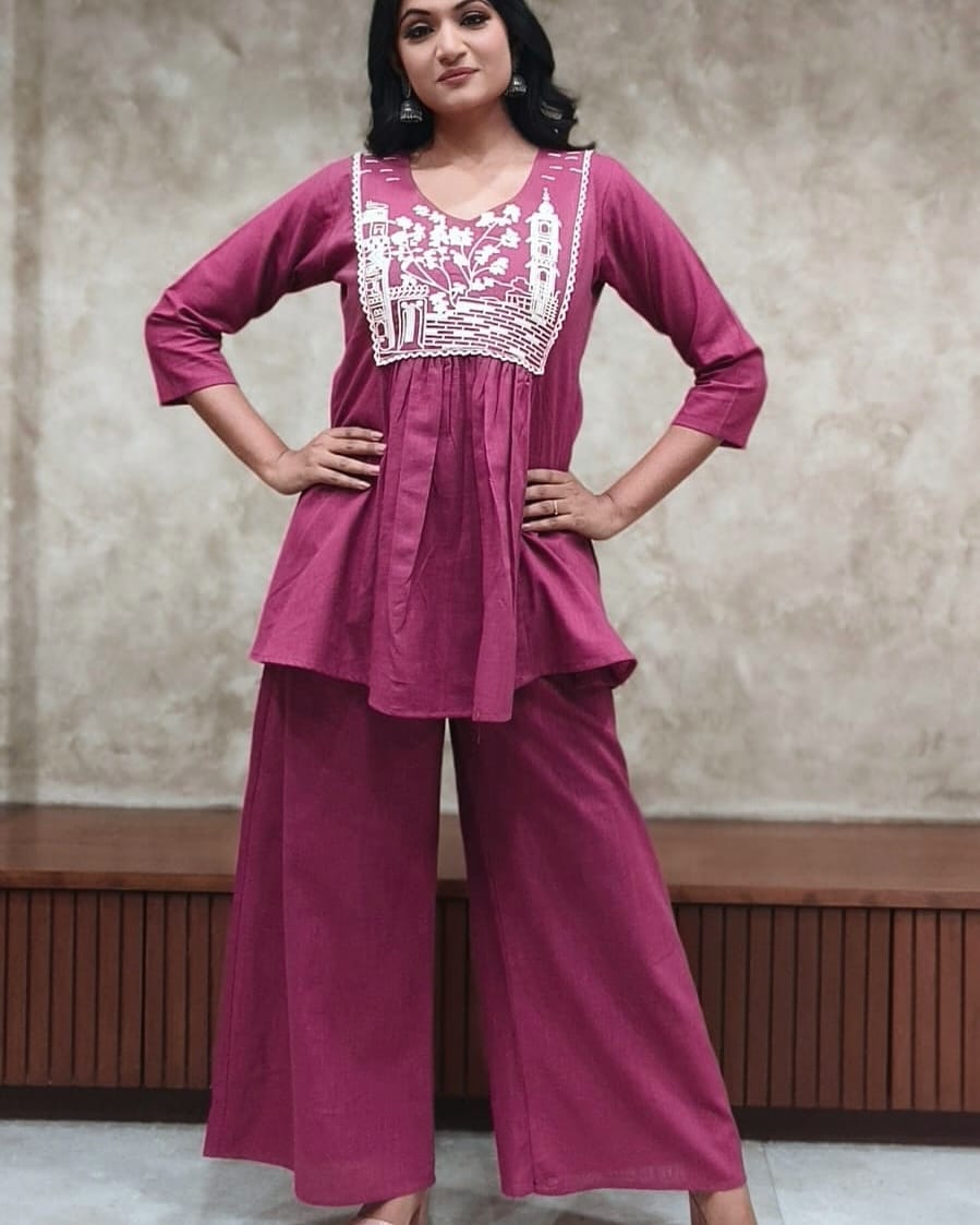 •  Purple Daily Wear Comfortable Cotton Short Top & Plazo Co Ord Set For Women (Set of 2)