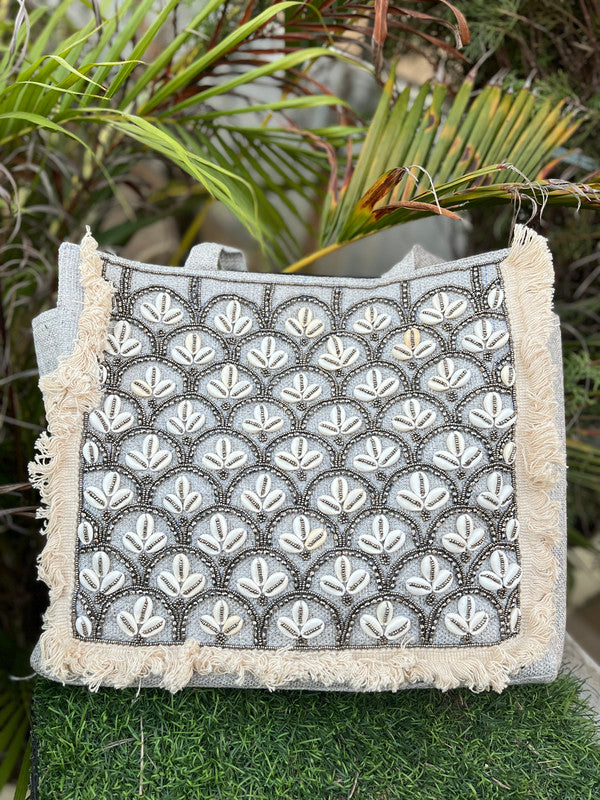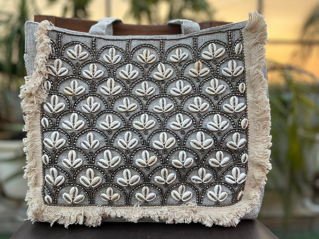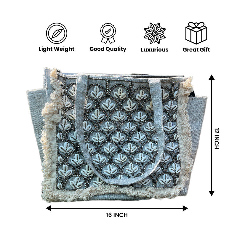 Bohemian Jute Tote Bag Ethnic Rajasthani Kaudi Beaded Embellished Stylish Shoulder Bag for Women