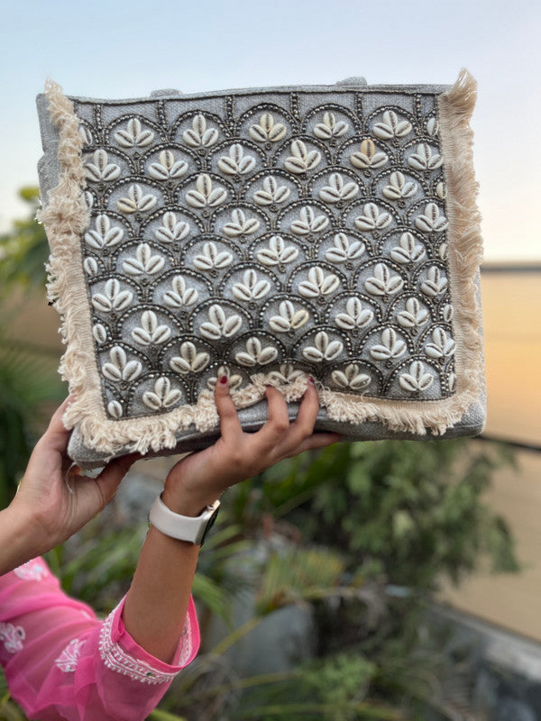 • Artisan Craftsmanship: Celebrate the beauty of handmade fashion with this stunning tote, featuring intricate Rajasthani motifs and detailed kaudi and pearl accents that showcase exceptional artistry