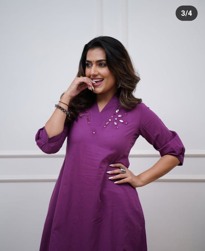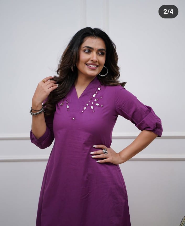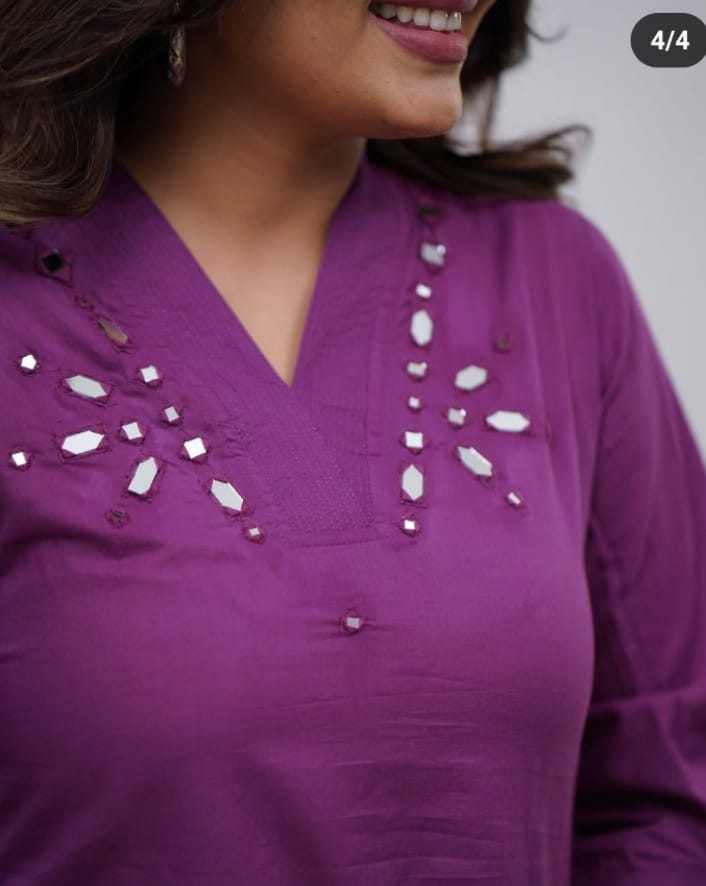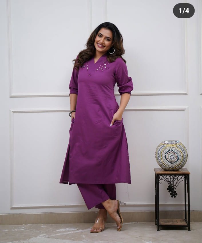 Purple Embroidered Co Ord Set Cotton Salwar Kameez V-Neck Kurti Pant Set for Women (Set of 2)