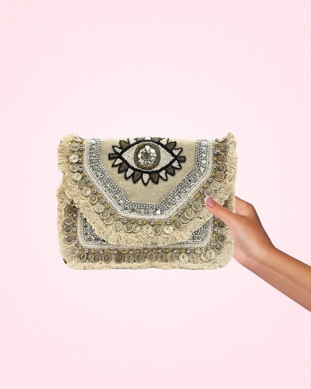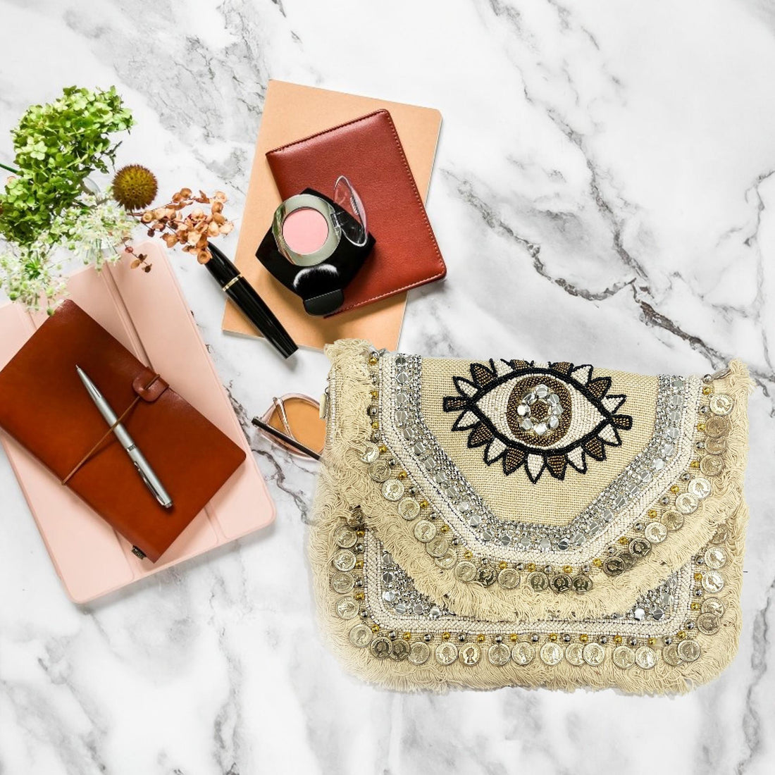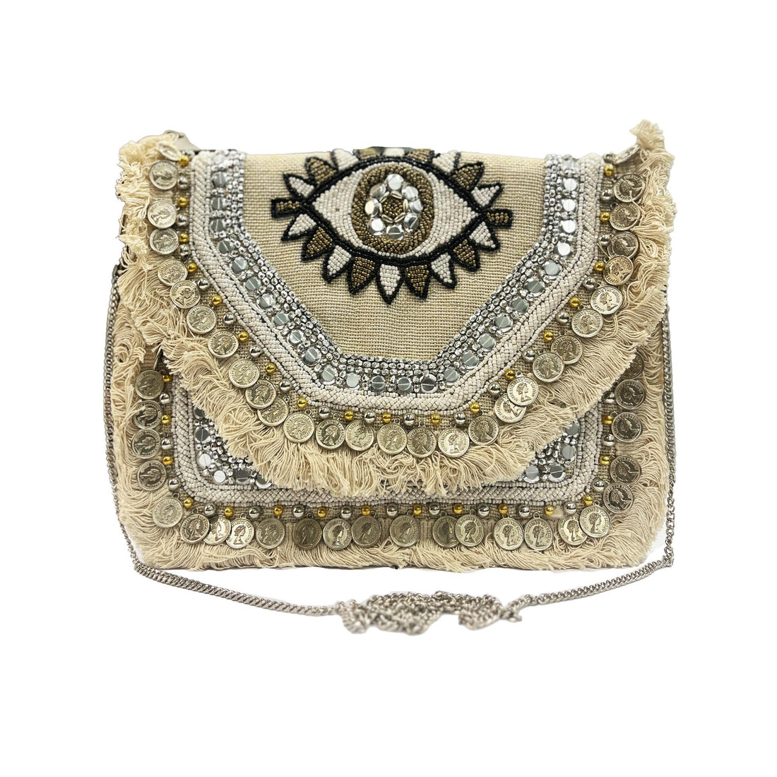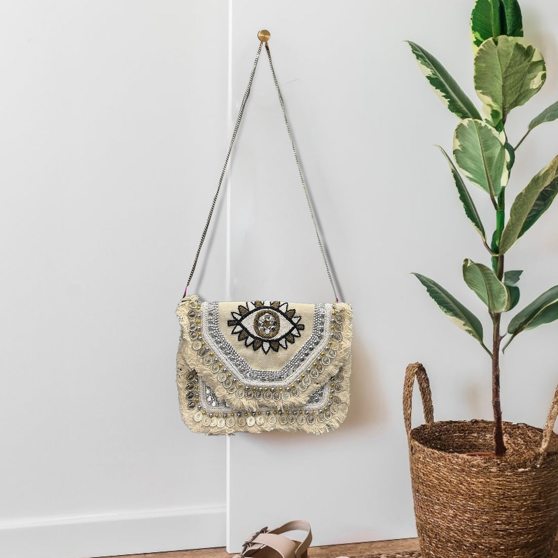 Bohemian Third Eye Sling Bag Vintage Coin & Beaded Embellished Crossbody Bag for Beach Outings