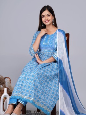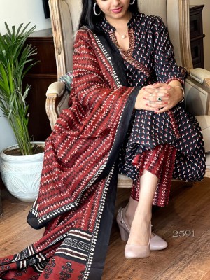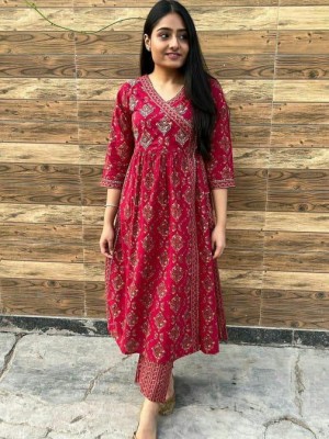 Red Printed Rayon Nayra Cut Angrakha Style Salwar Kameez Suit Kurti Pant Set