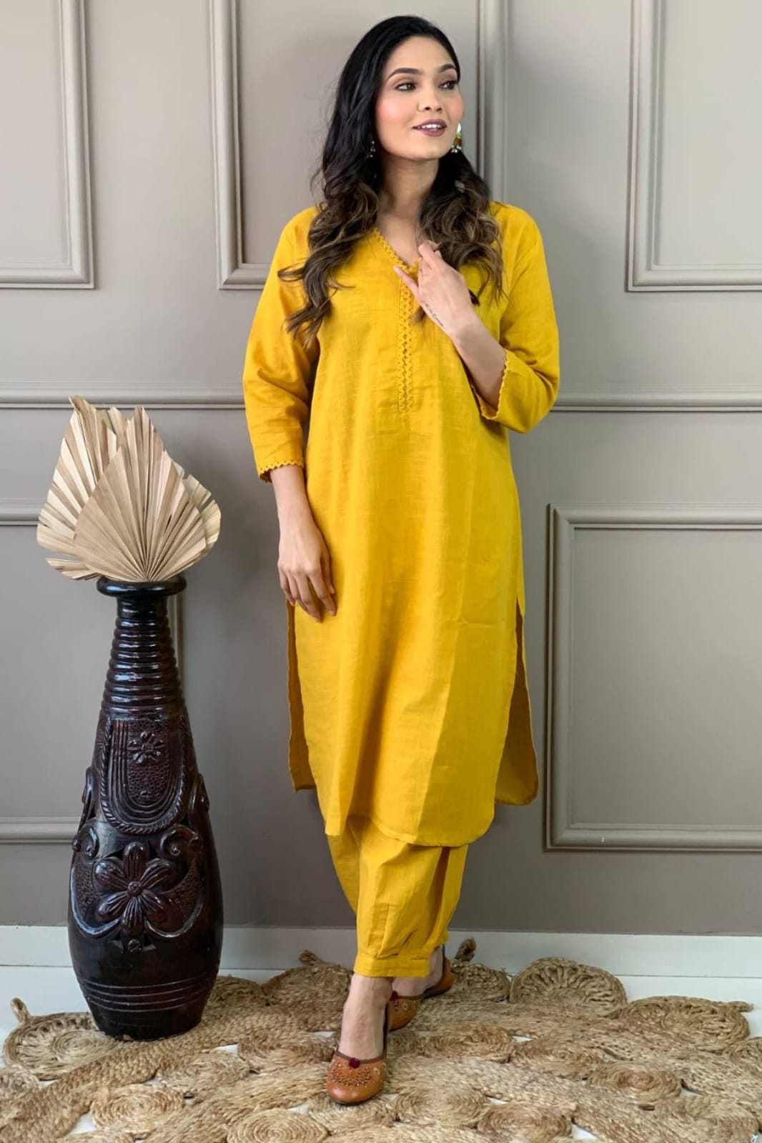Yellow Cotton Slub Kurti Afghani Pant Cord Set Dress for Women Ethnic V-Neck Salwar Kameez