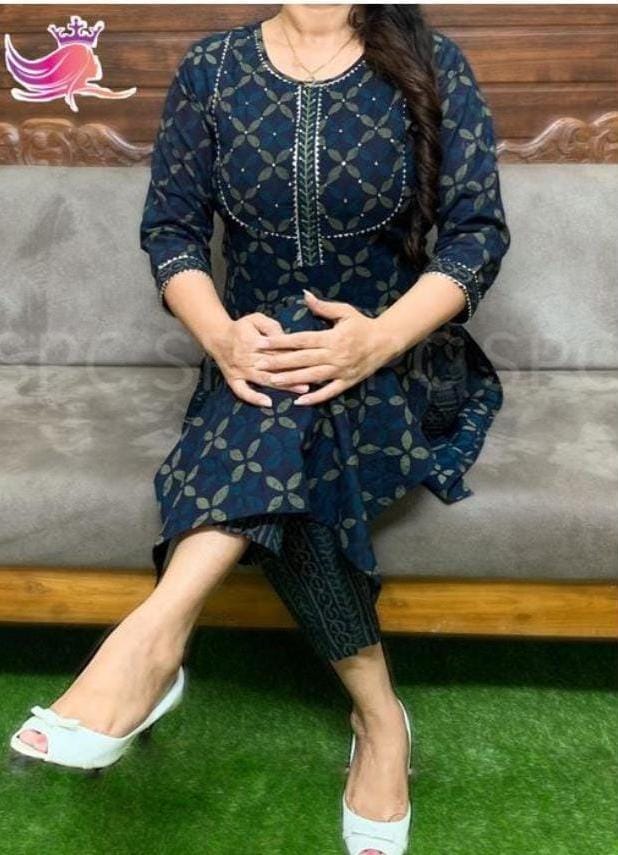 Savannah Blue Leaf Printed Indian Cotton Salwar Kameez Straight Kurti Pant Co Ord Set for Women