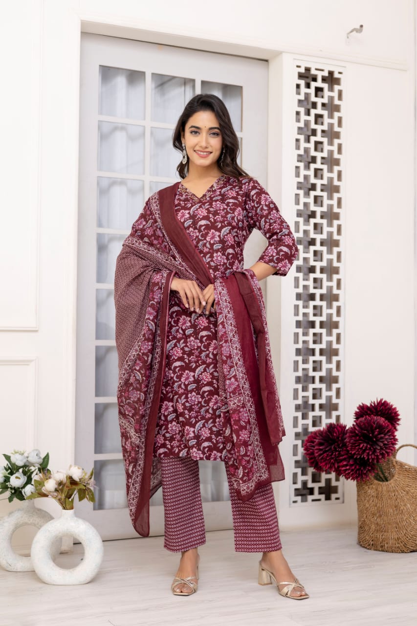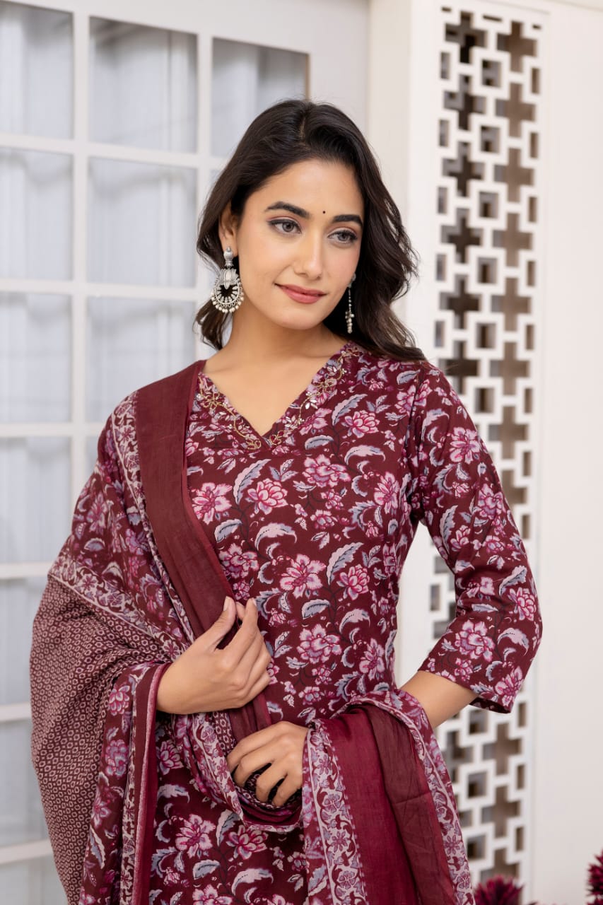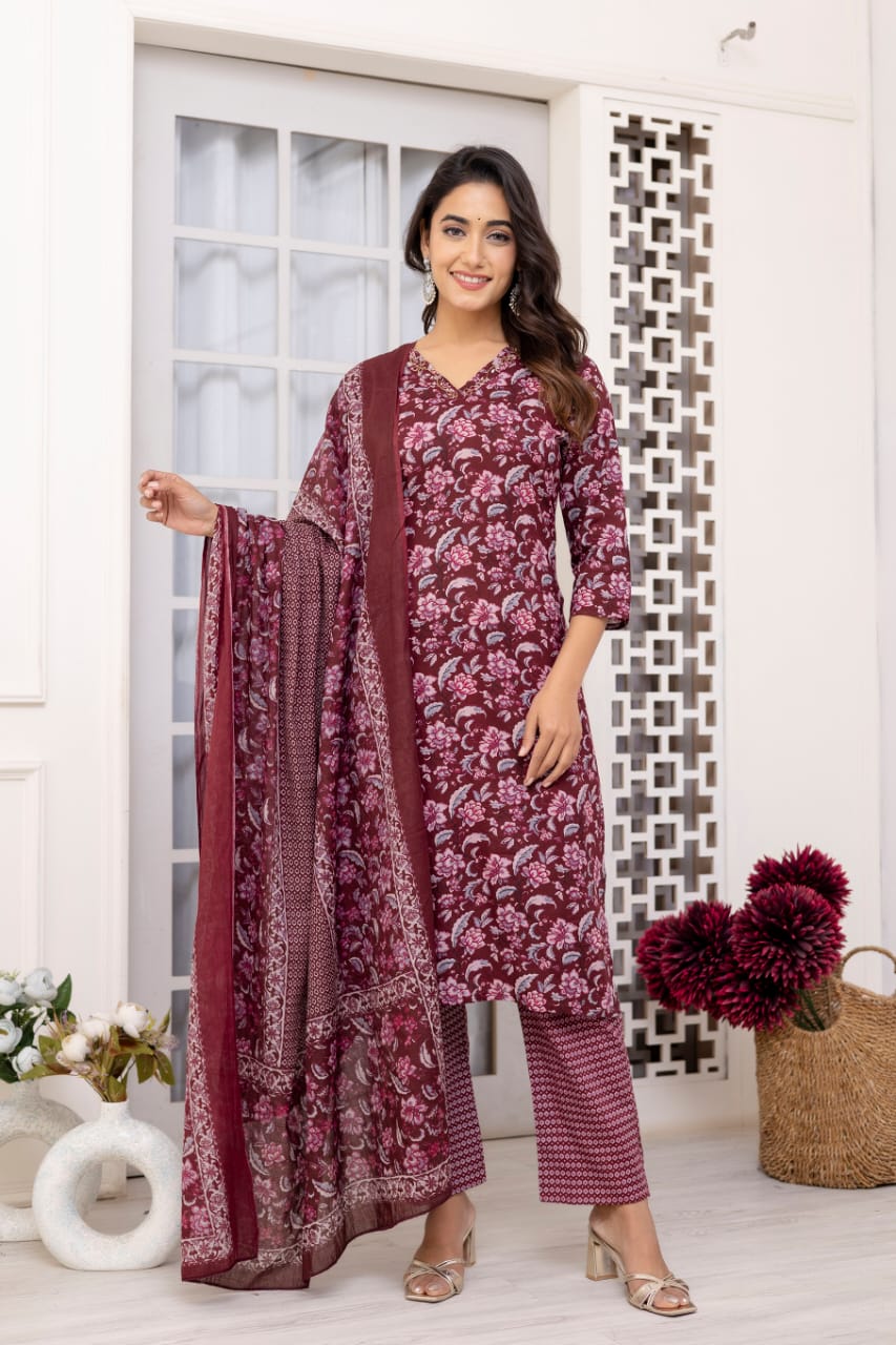 Maroon Floral Printed Straight Kurta Pant Dupatta Set Indian Cotton Straight Salwar Kameez Set Summer (Set of 3)