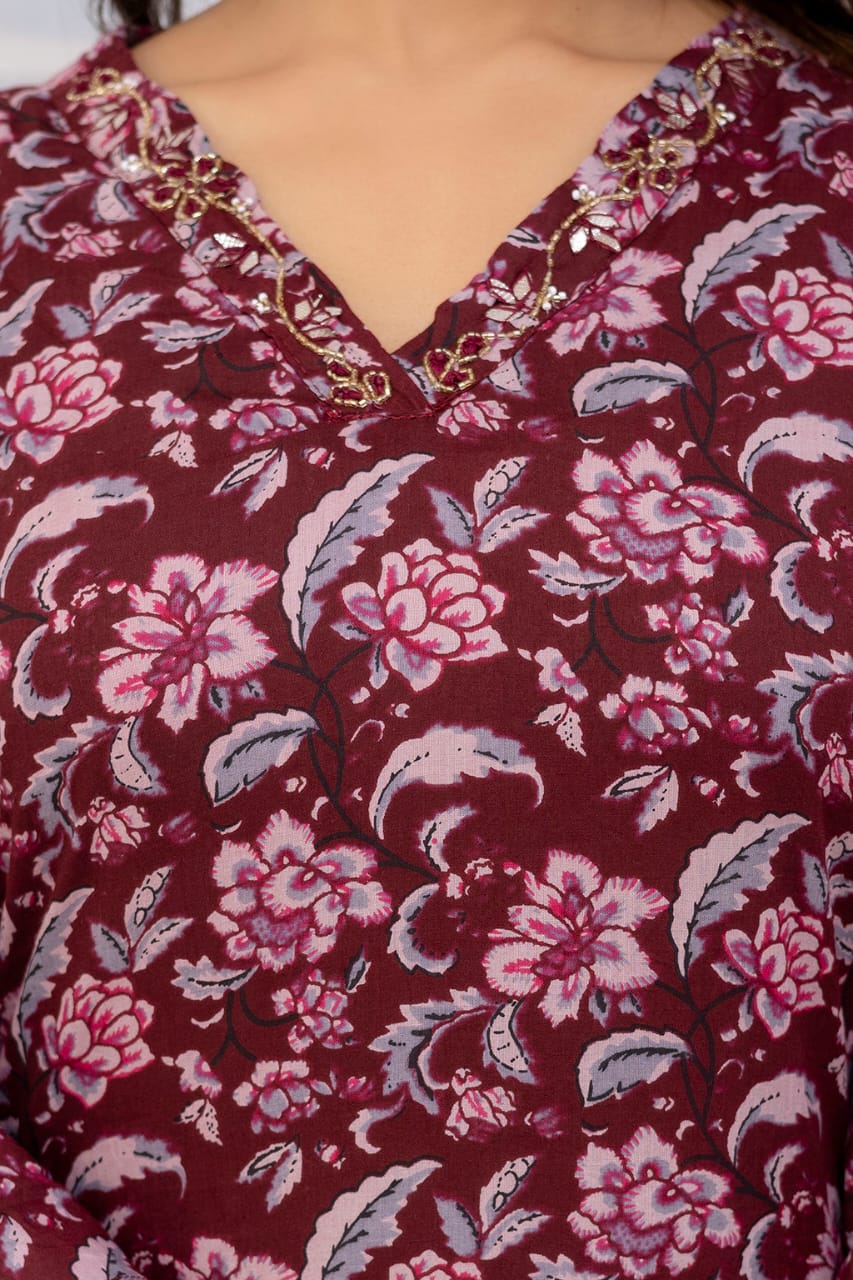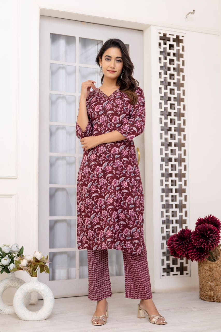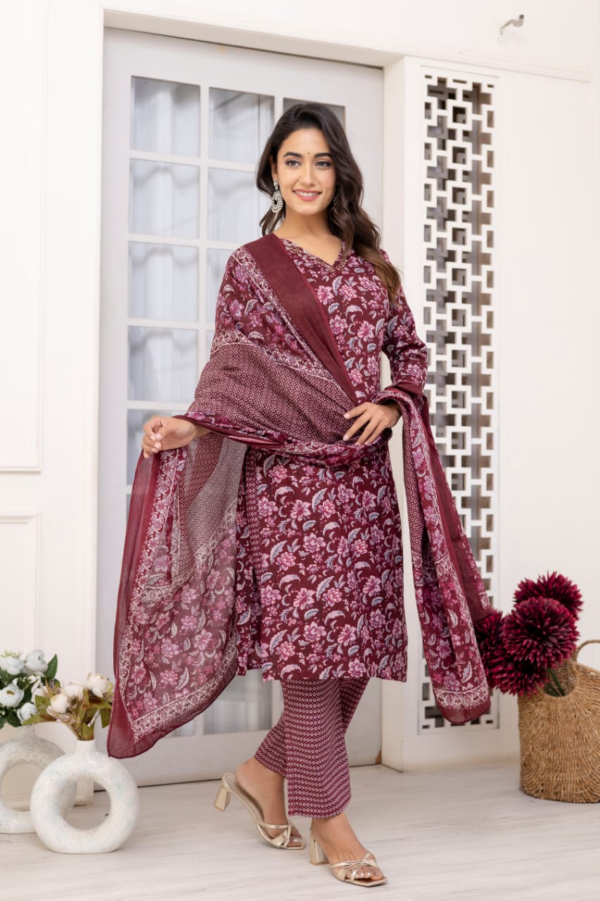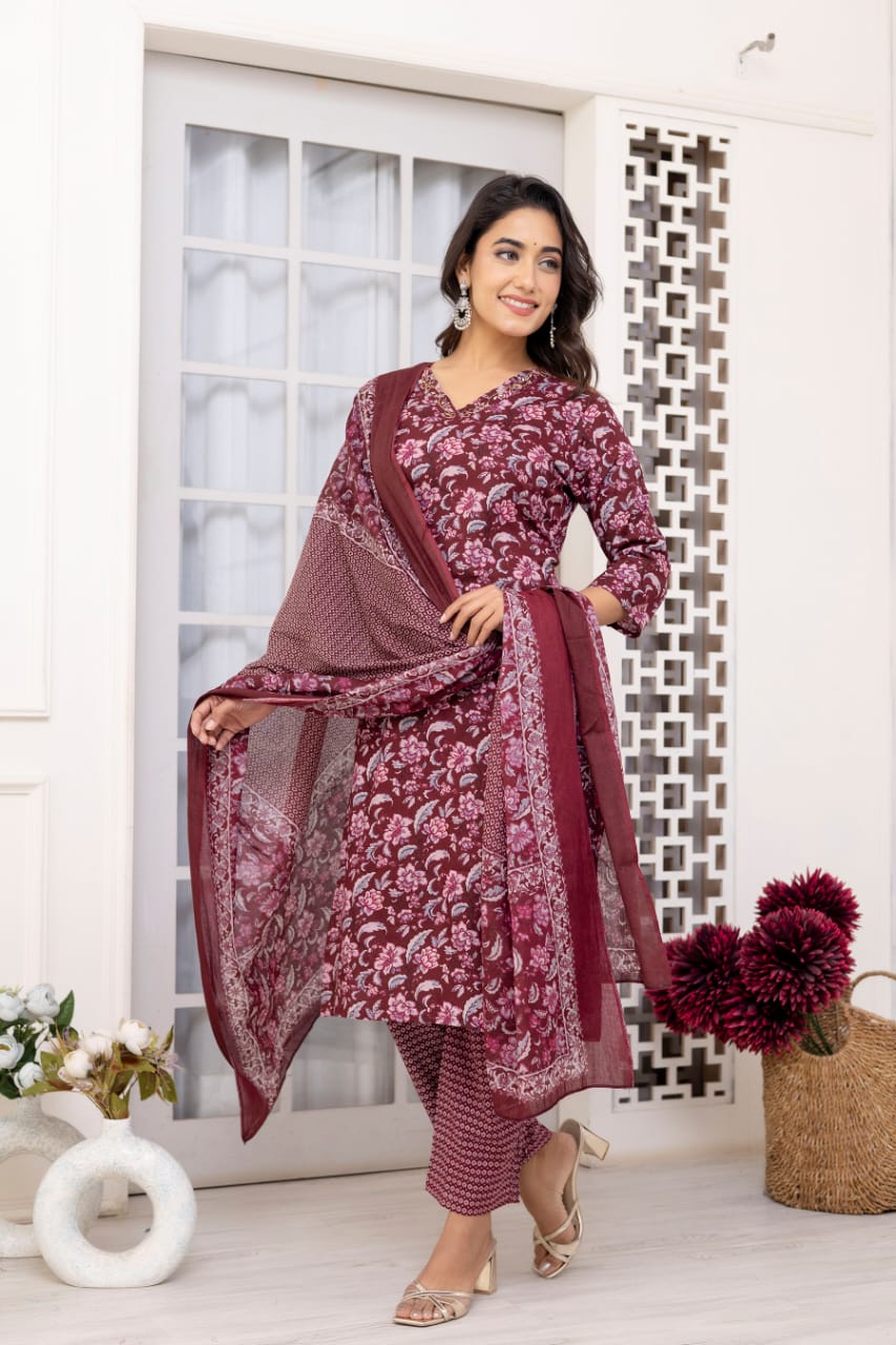 Maroon Floral Printed Straight Kurta Pant Dupatta Set Indian Cotton Straight Salwar Kameez Set Summer (Set of 3)