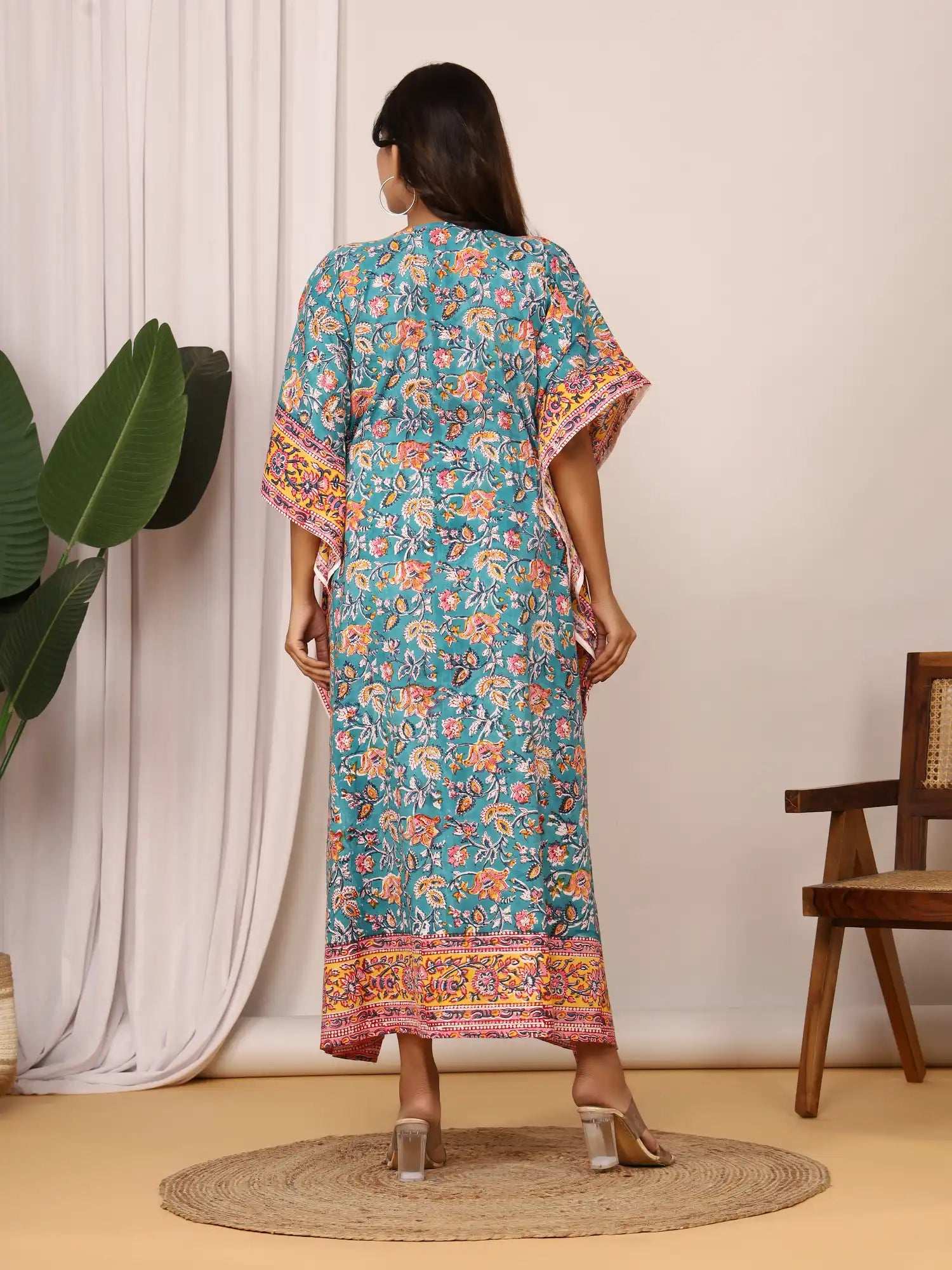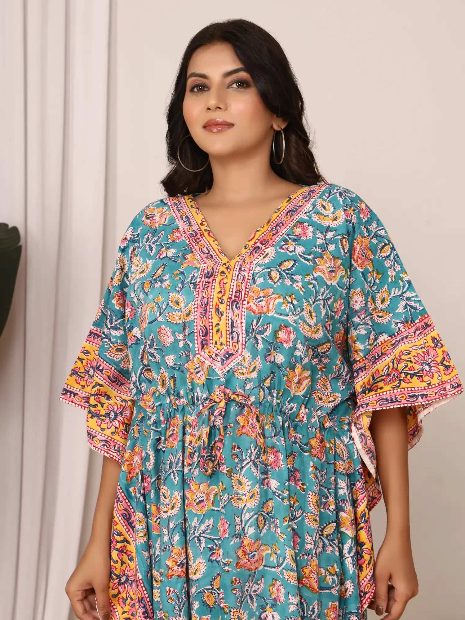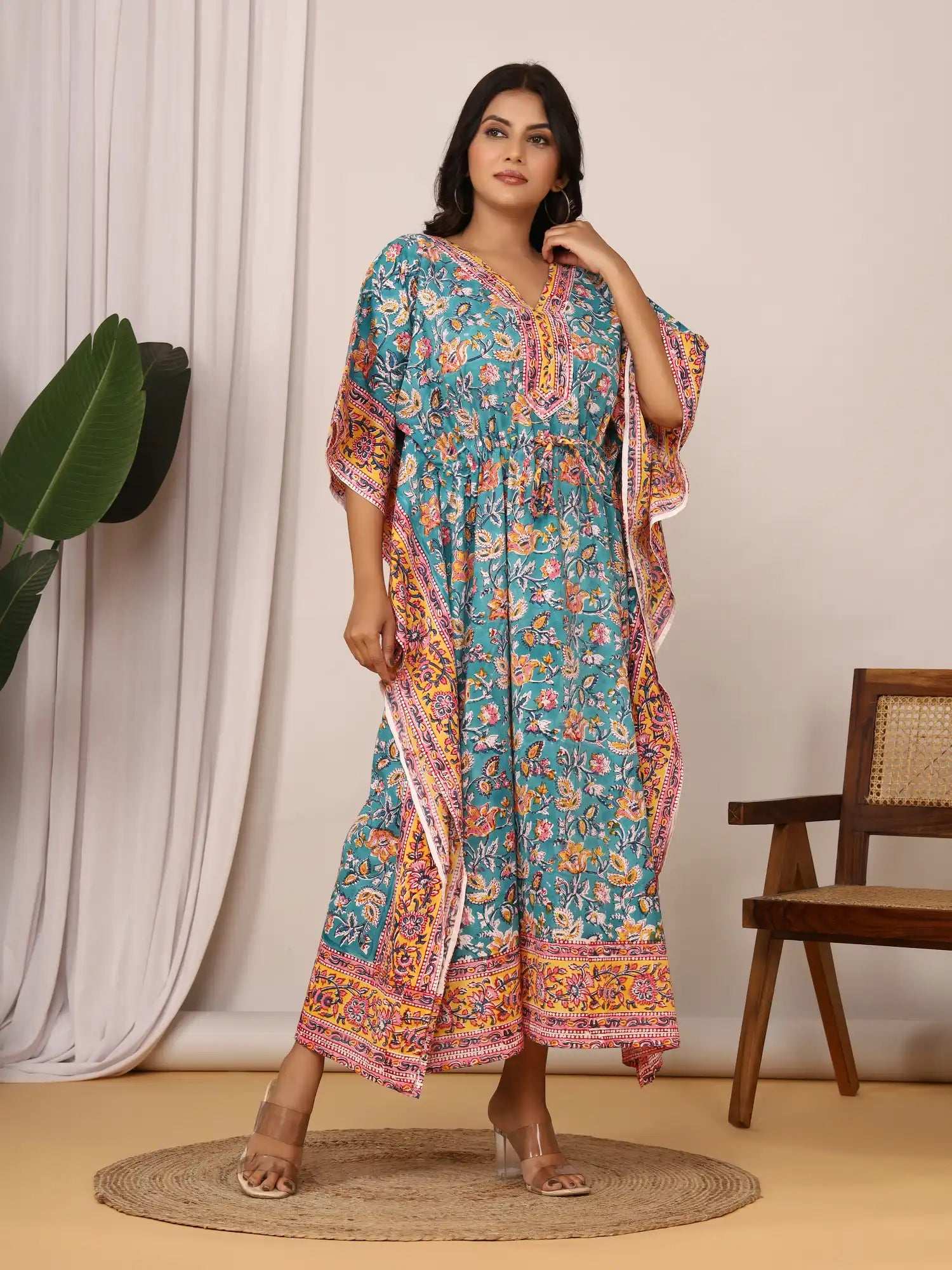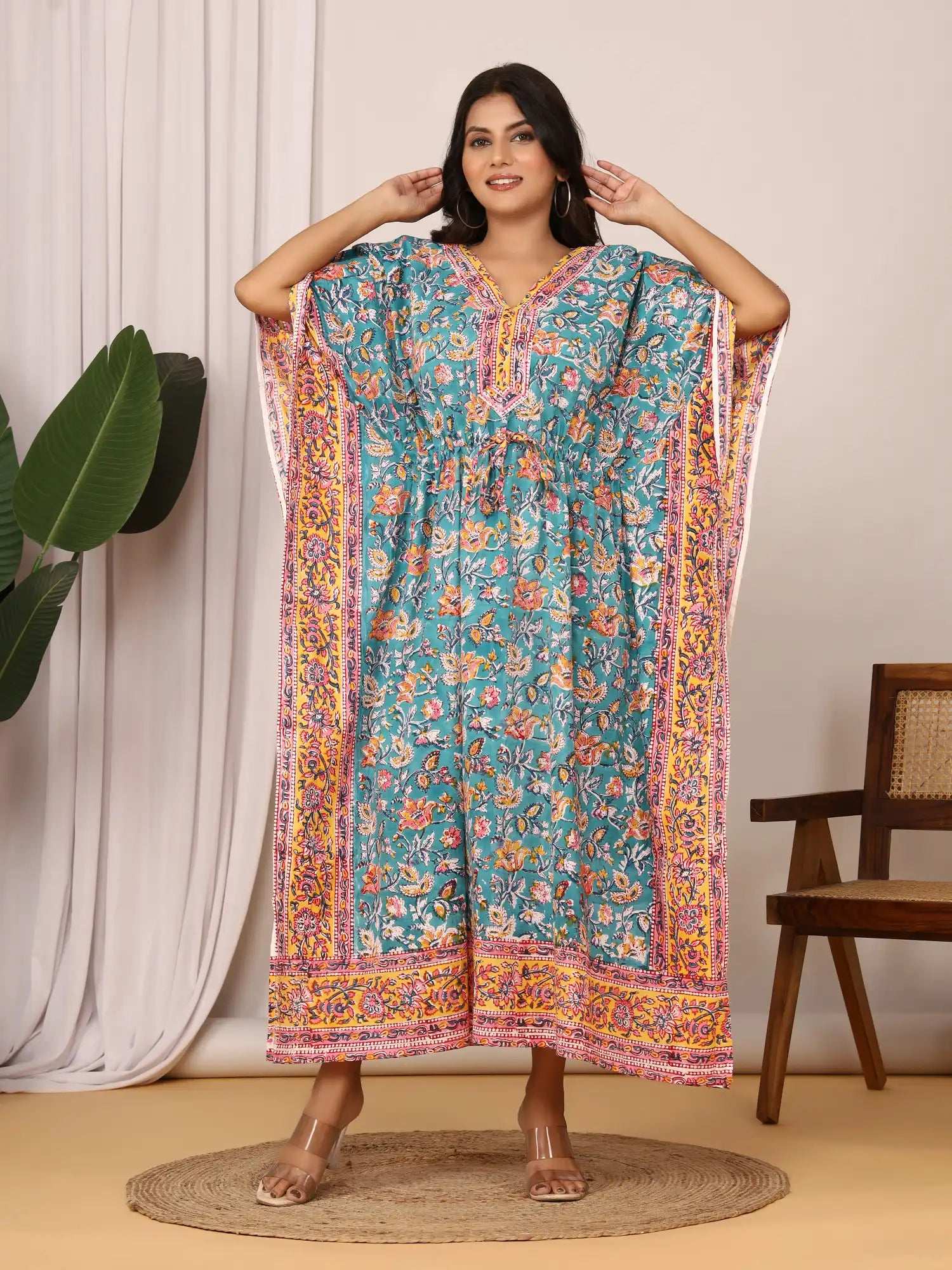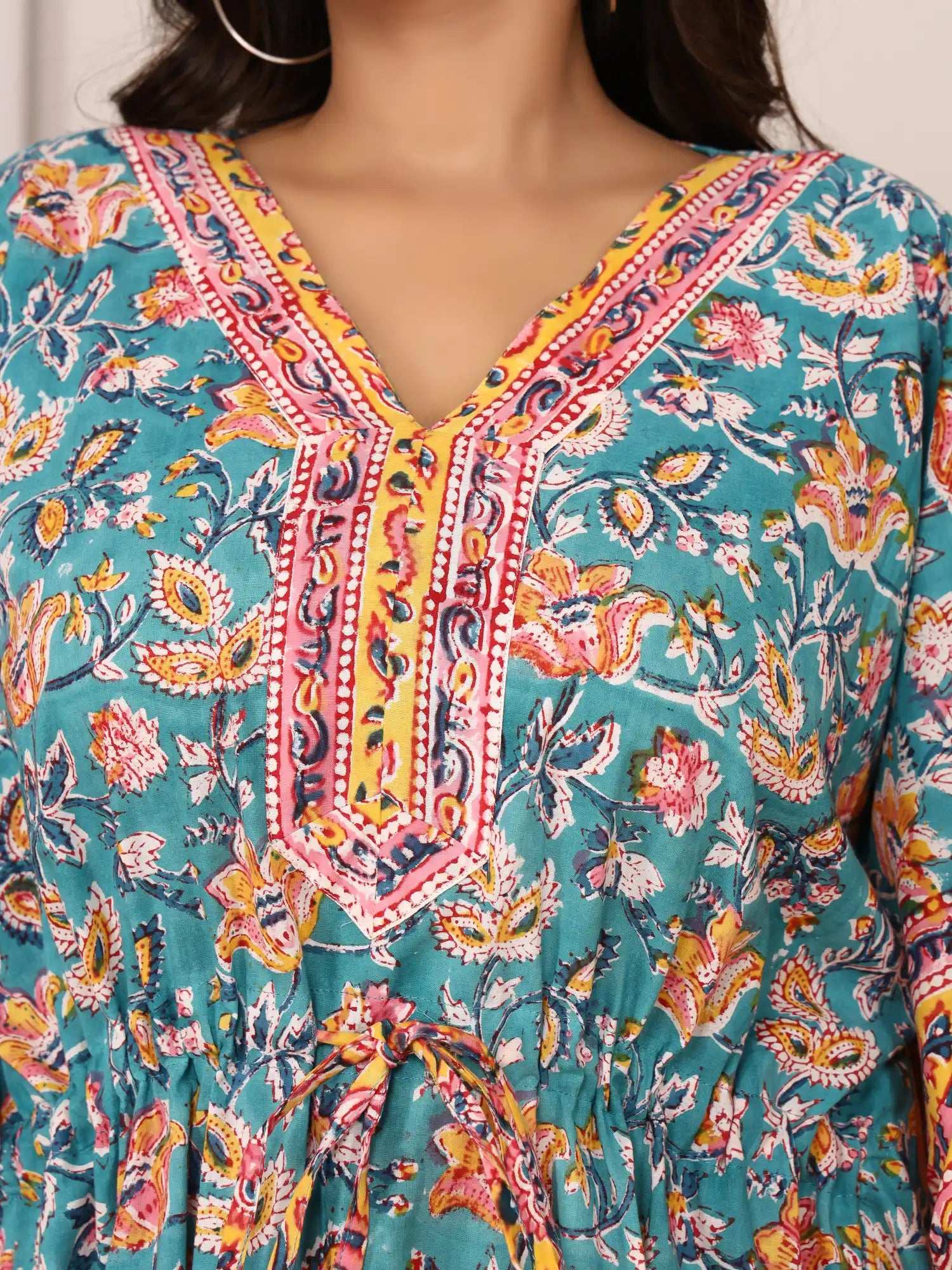 Add a splash of charm to your wardrobe with this pure cotton Sanganeri print kaftan. Featuring a stylish V-neckline adorned with a contrasting floral border, it effortlessly blends elegance and tradition. The adjustable drawstring waist ensures a flattering silhouette, while the breathable cotton fabric offers all-day comfort. Ideal for lounging, casual outings, or festive gatherings.